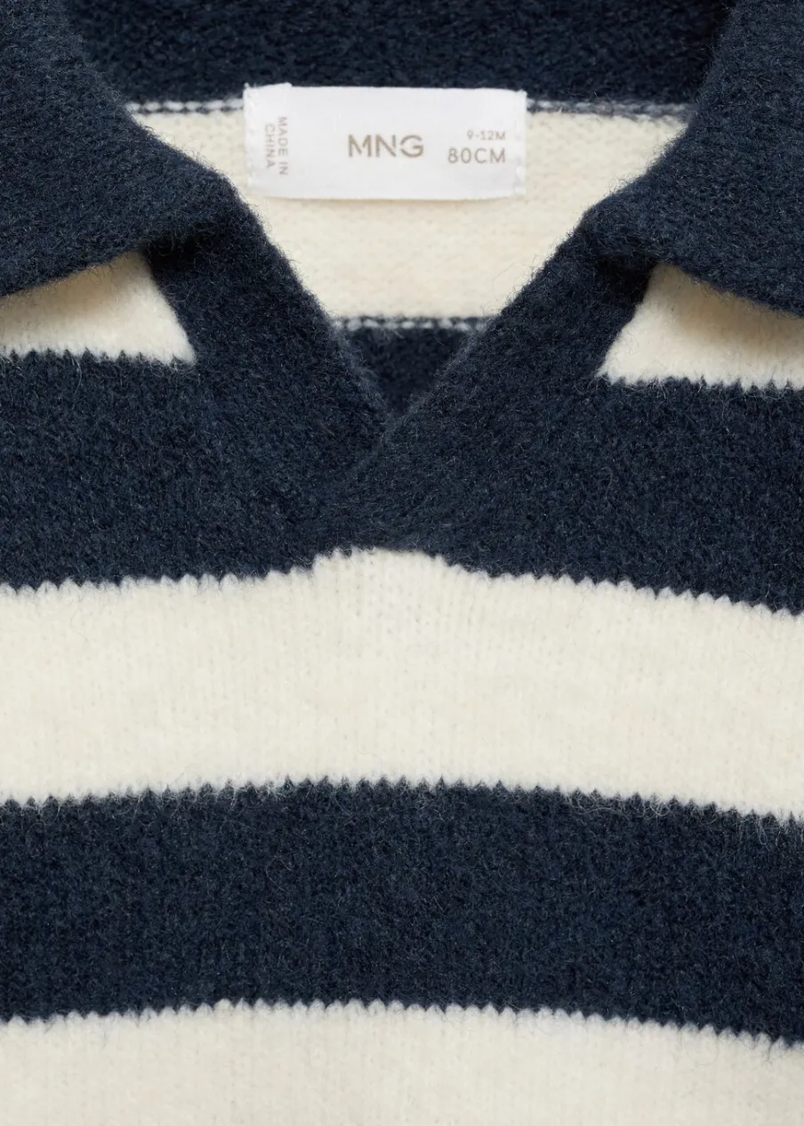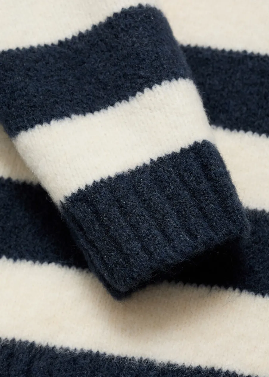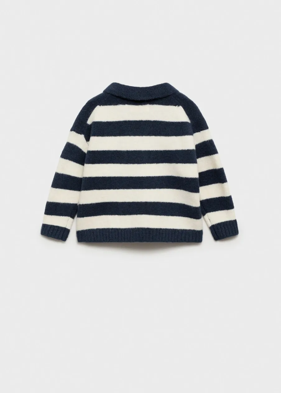 OpisTkanina z grubej dzianiny. Wzór w paski. Kołnierzyk polo. Długi rękaw. Bez zapięcia. Model prosty.