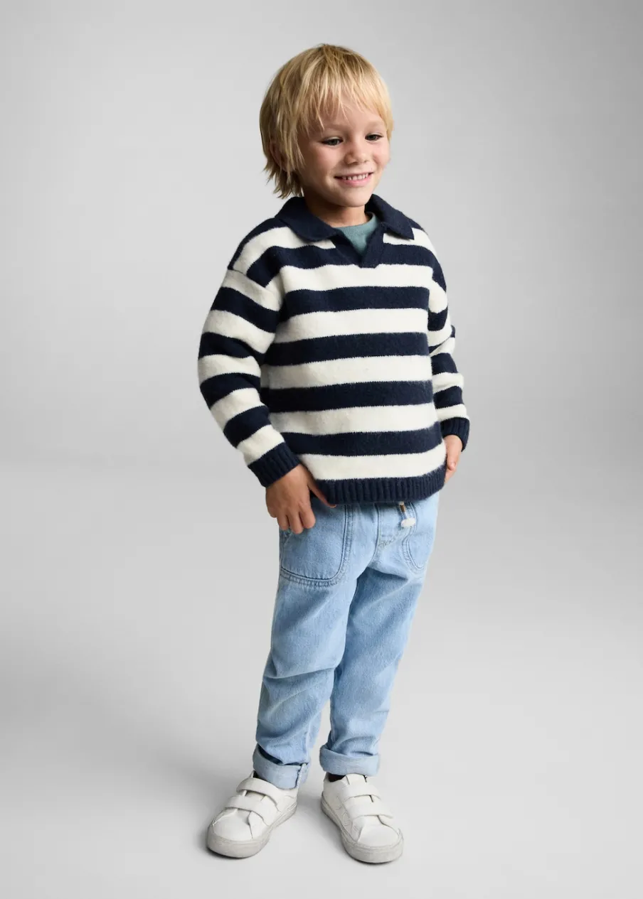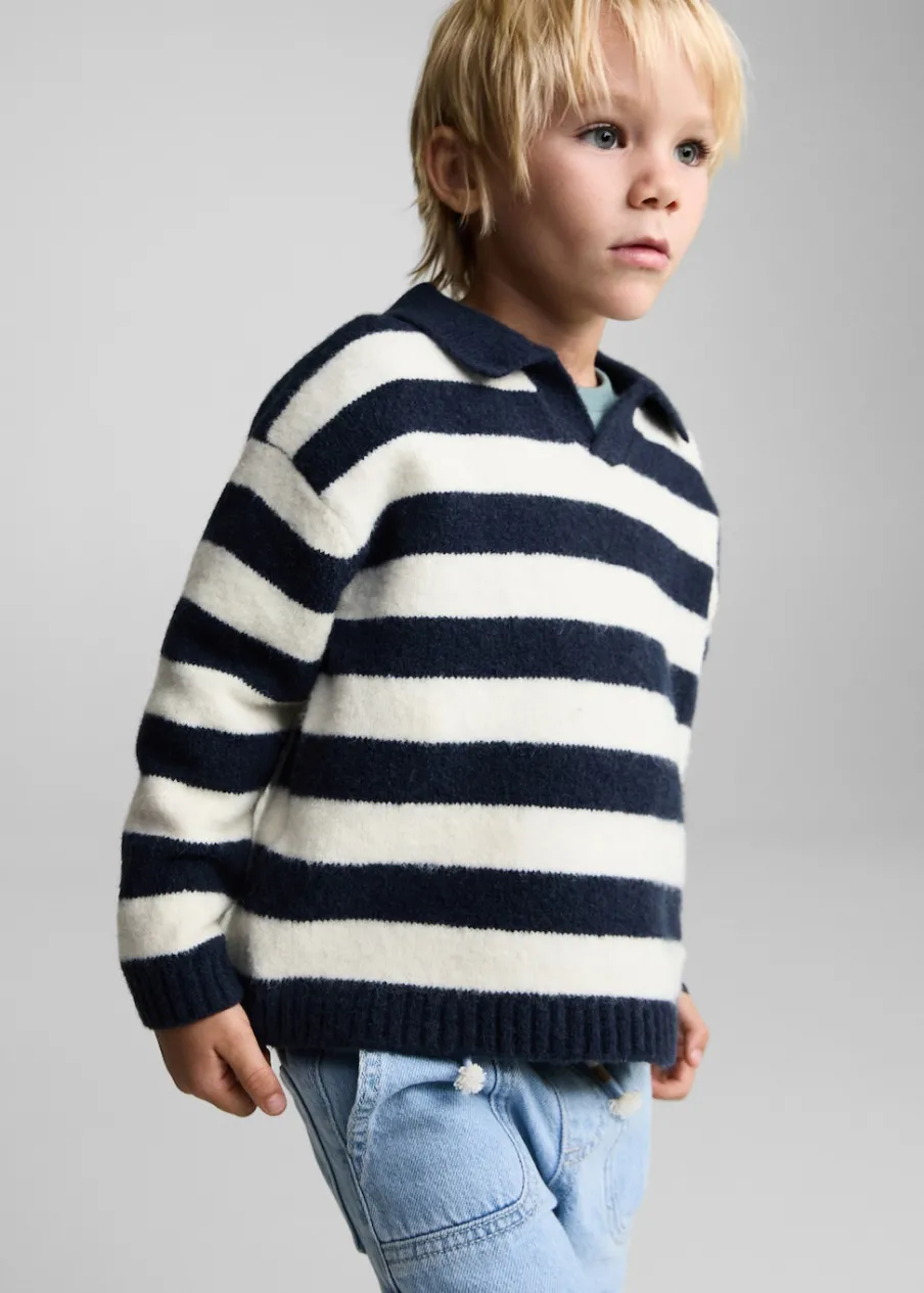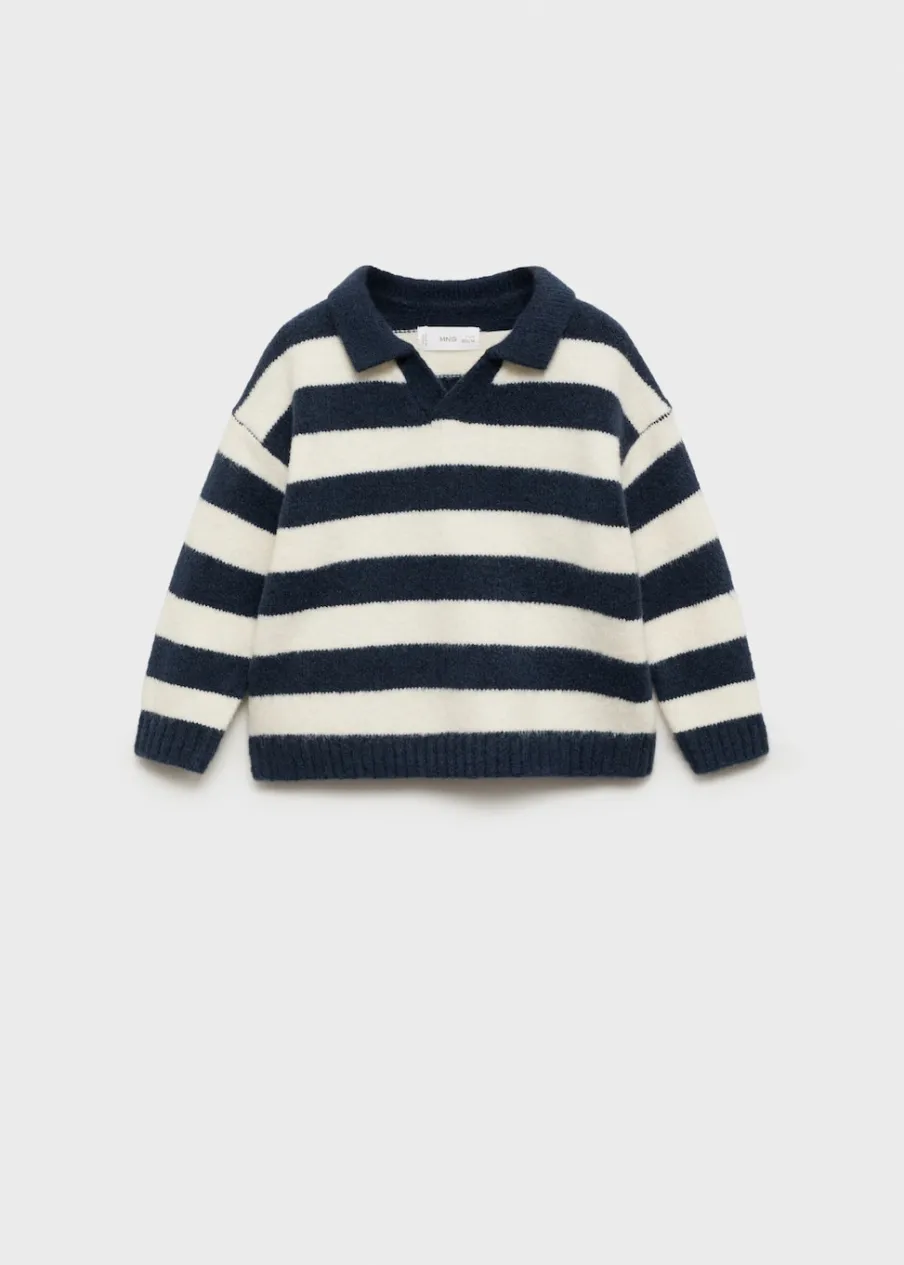 OpisTkanina z grubej dzianiny. Wzór w paski. Kołnierzyk polo. Długi rękaw. Bez zapięcia. Model prosty.