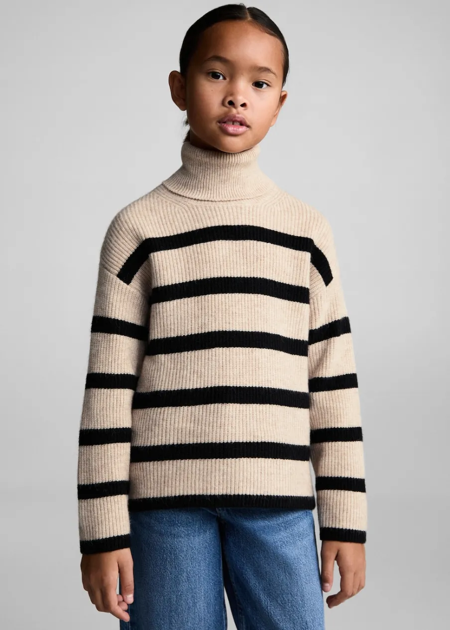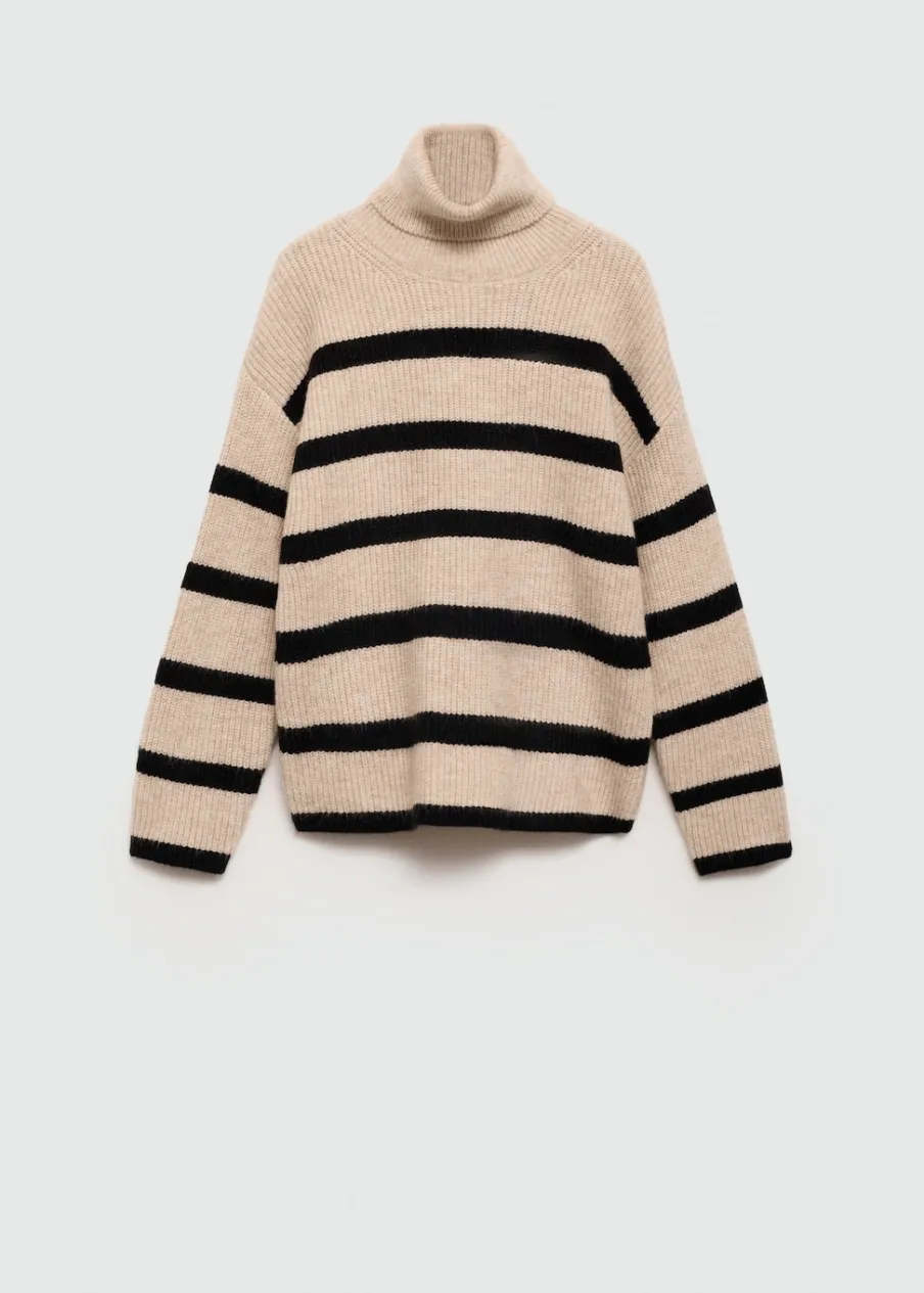 Tkanina z grubej dzianiny. Model prosty. Wzór w paski. Golf. Długi rękaw.
