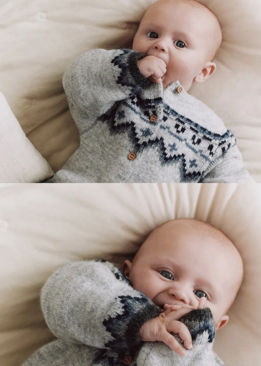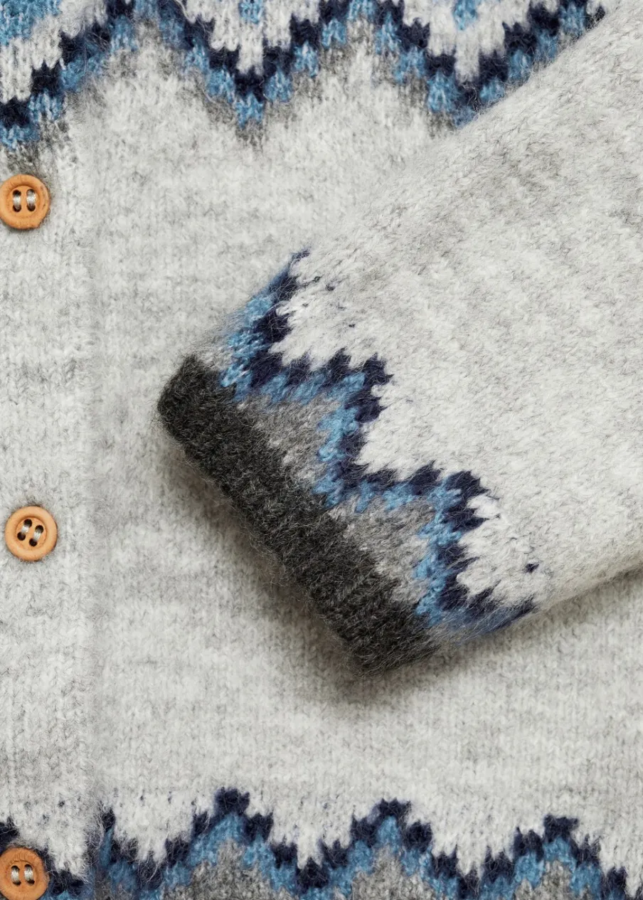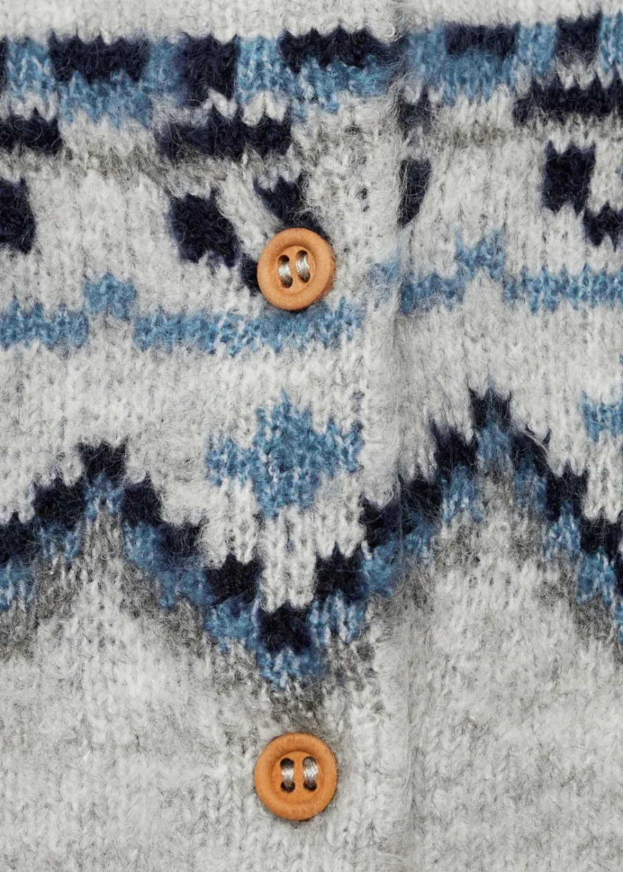 Dzianina średniej grubości. Długi rękaw. Zapięcie na guziki. Okrągły dekolt. Zapięcie z przodu. Model prosty. Żakardowy wzór.