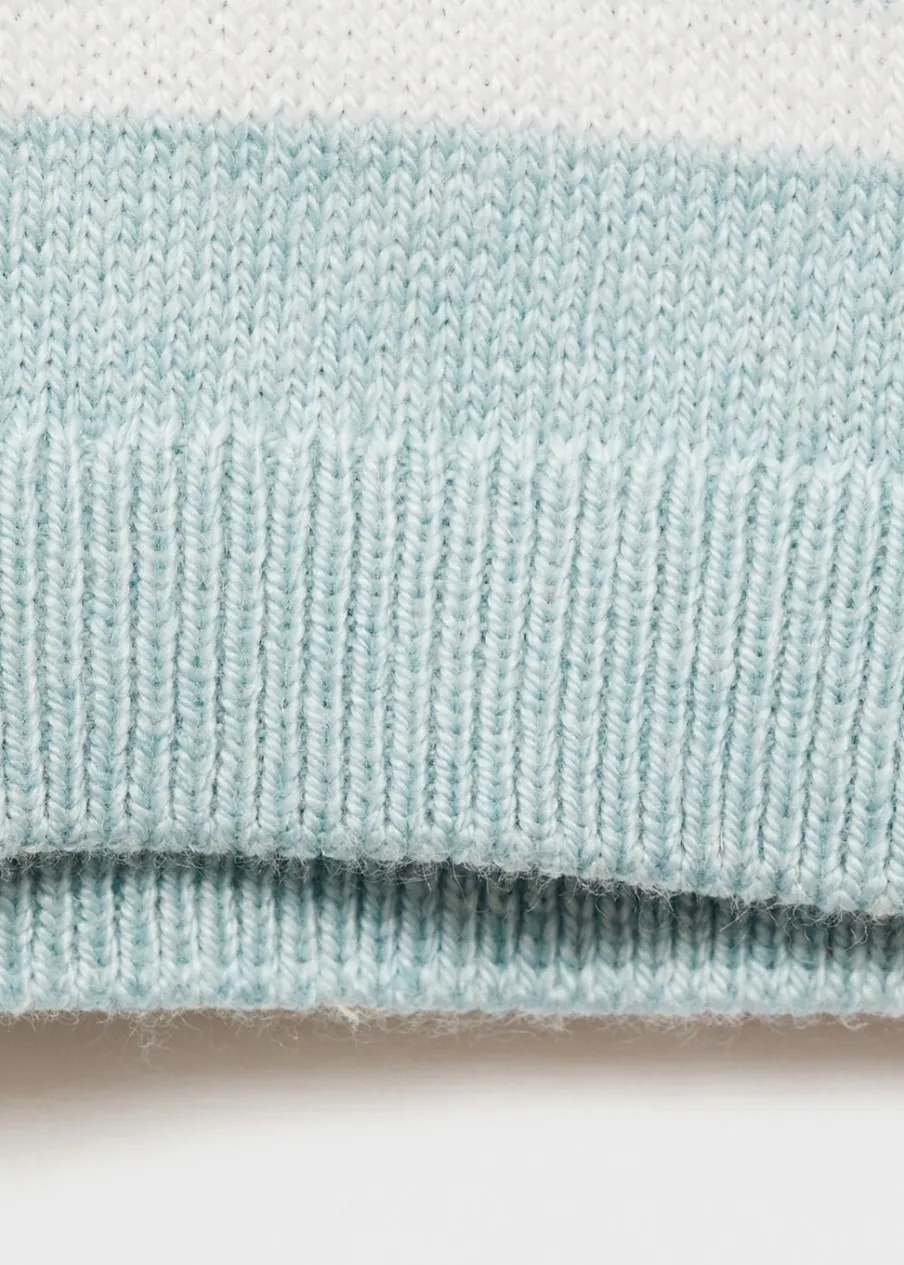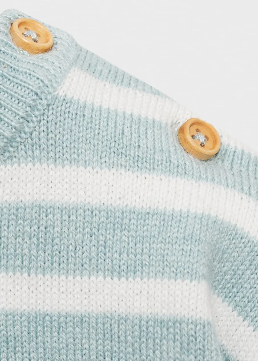 Bawełniana tkanina. Deseń w pasy. Okrągły dekolt. Długi rękaw. Zapięcie na guziki na ramieniu. Kołnierz, mankiety i dół z prążkowanej dzianiny. Guziki z imitacji drewna.