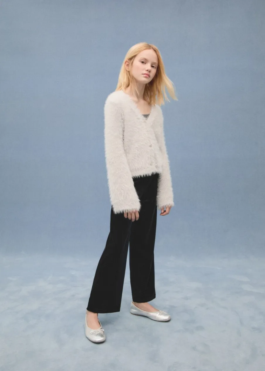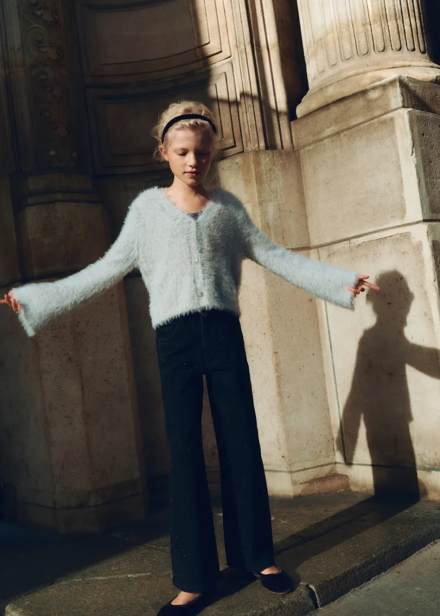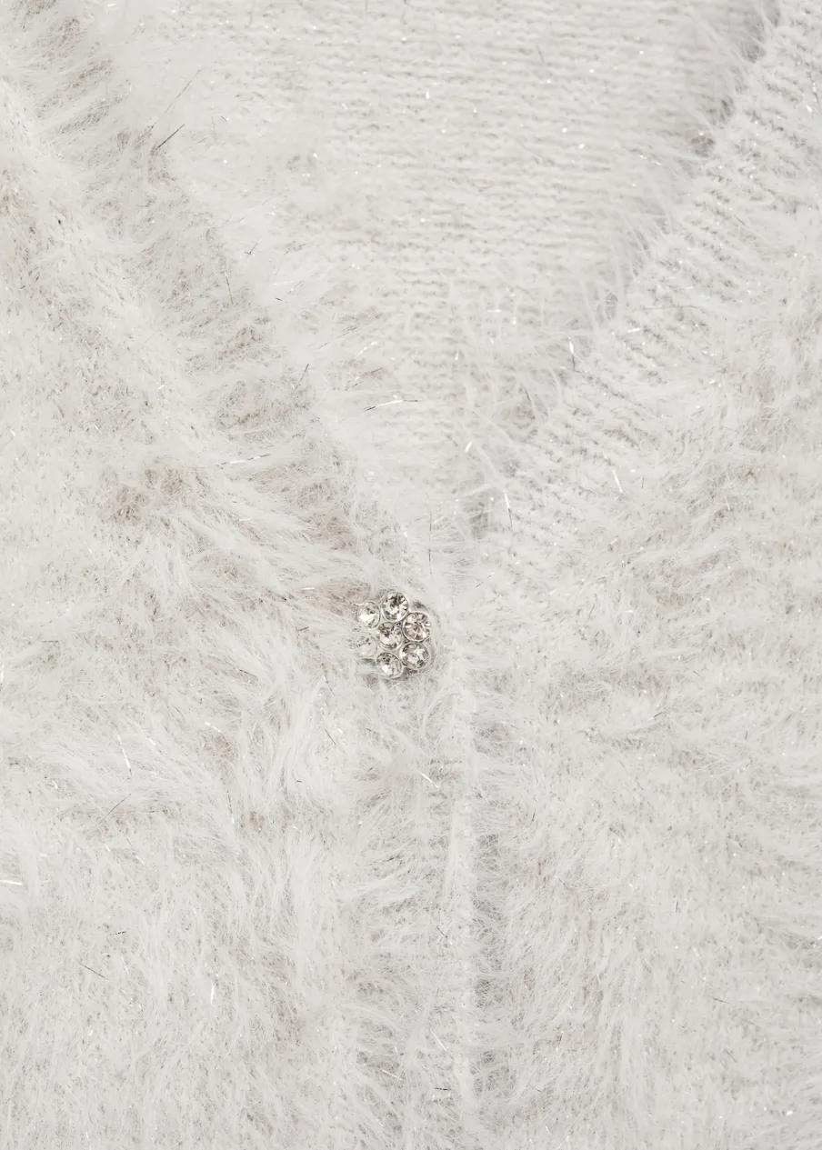 Długi rękaw. Model prosty. Dekolt V. Włochata tekstura. Biżuteryjne guziki. Kolekcja wieczorowa i imprezowa.