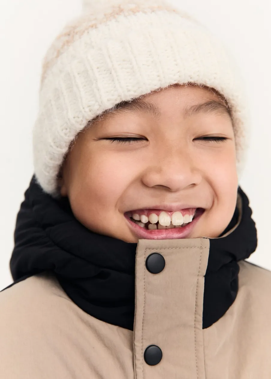 OpisKolekcja Powrót do szkoły. Dzianinowa tkanina. Żakardowa tkanina. Detal z pomponem.