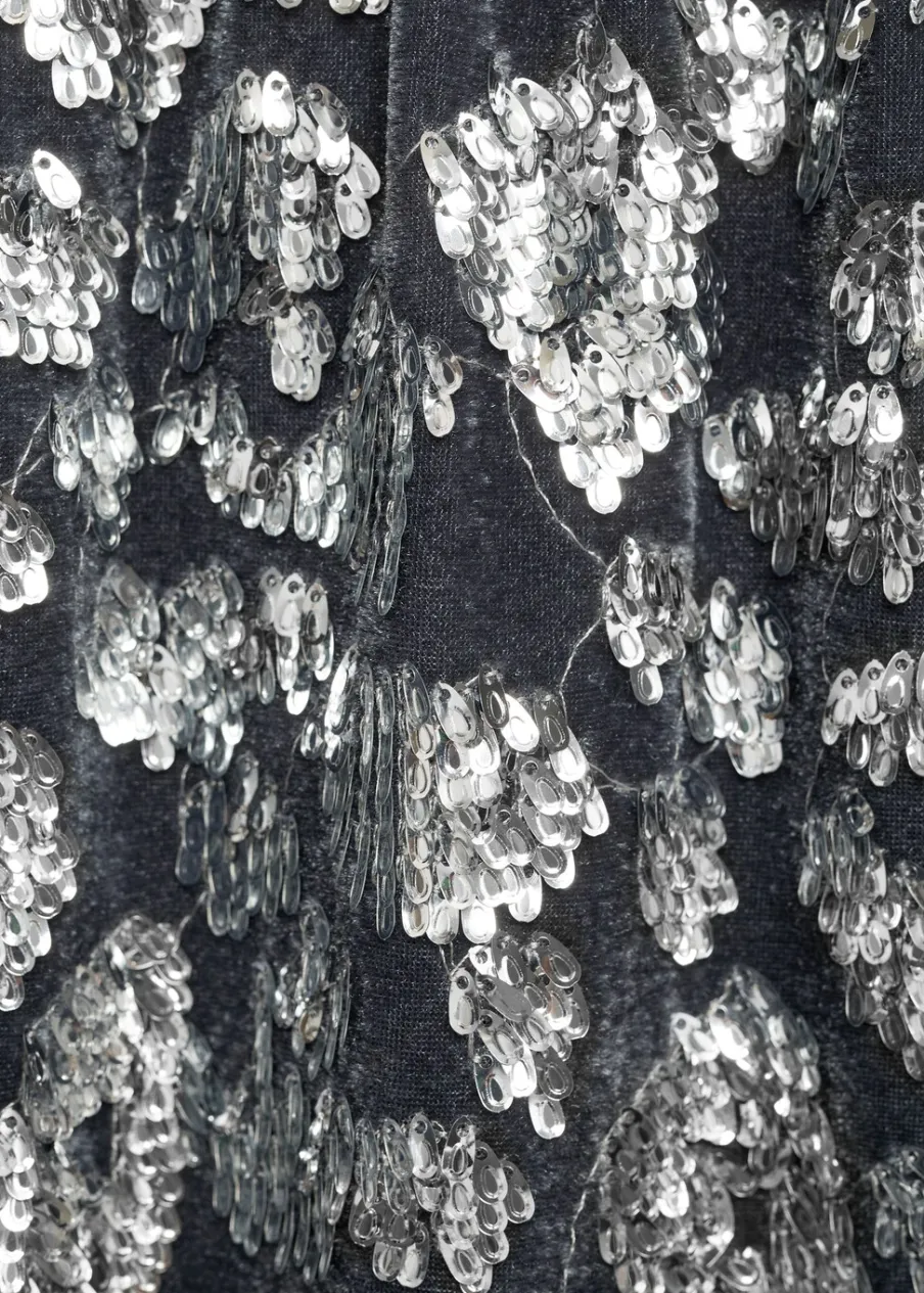 Z ozdobnymi cekinami. Krótki krój. Model prosty. Total look. Wewnętrzna podszewka. Kolekcja wieczorowa i imprezowa. Kolekcja Bożonarodzeniowa.
