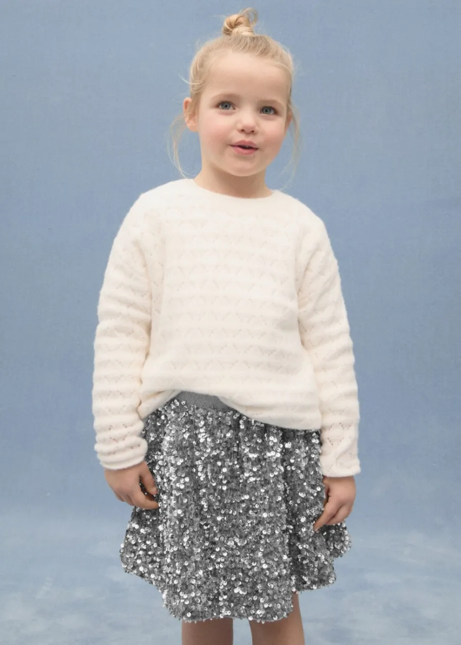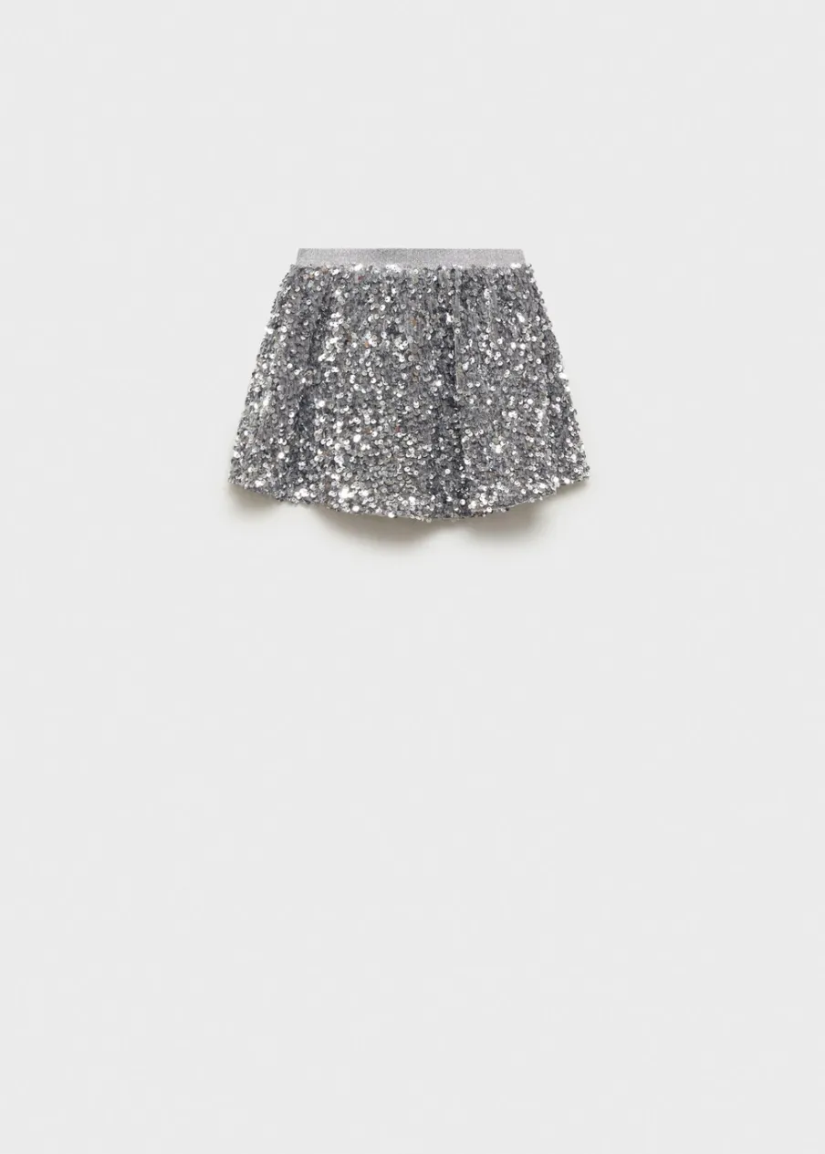 Cekinowa ozdoba. Krótki krój. Elastyczna gumka. Wewnętrzna podszewka. Elastyczny pas. Model evasé. Bez zapięcia.