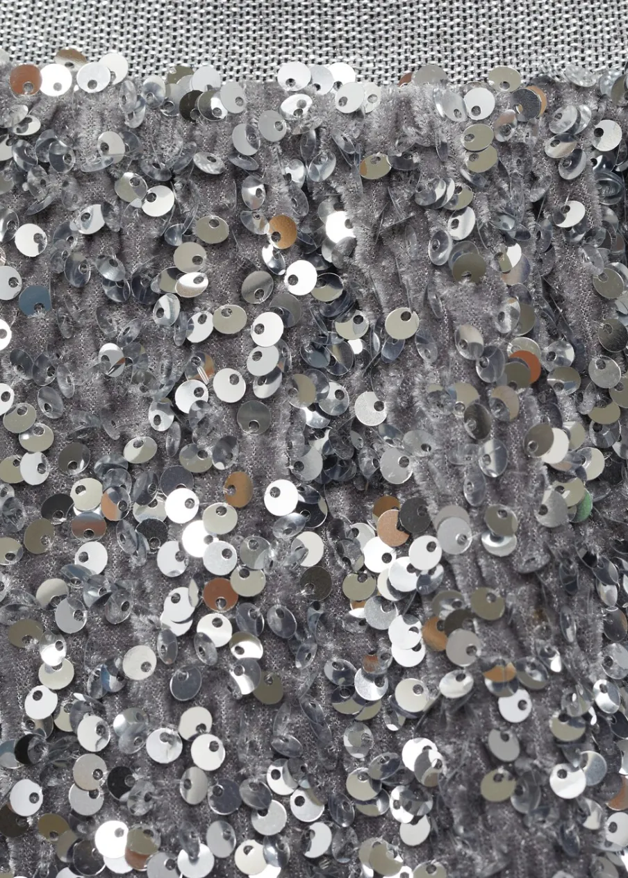 OpisCekinowa ozdoba. Krótki krój. Elastyczna gumka. Wewnętrzna podszewka. Elastyczny pas. Model evasé. Bez zapięcia…