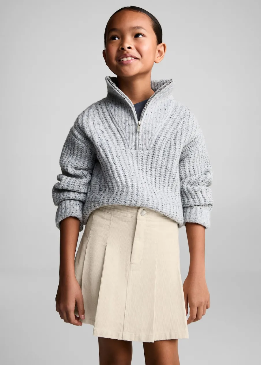 Kolekcja Powrót do szkoły. Tkanina z bawełną. Krótki krój. Zapięcie na suwak i guzik. Model prosty.