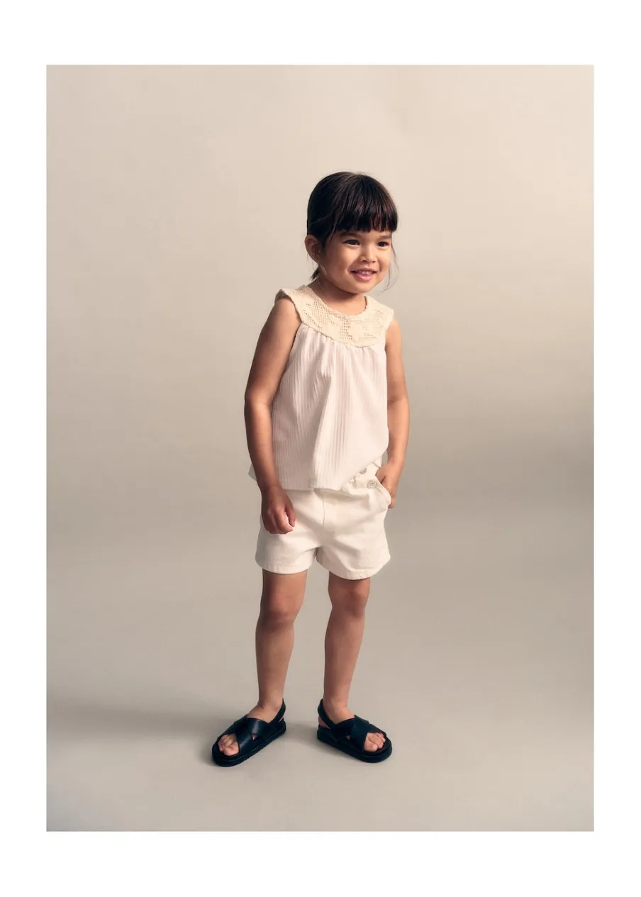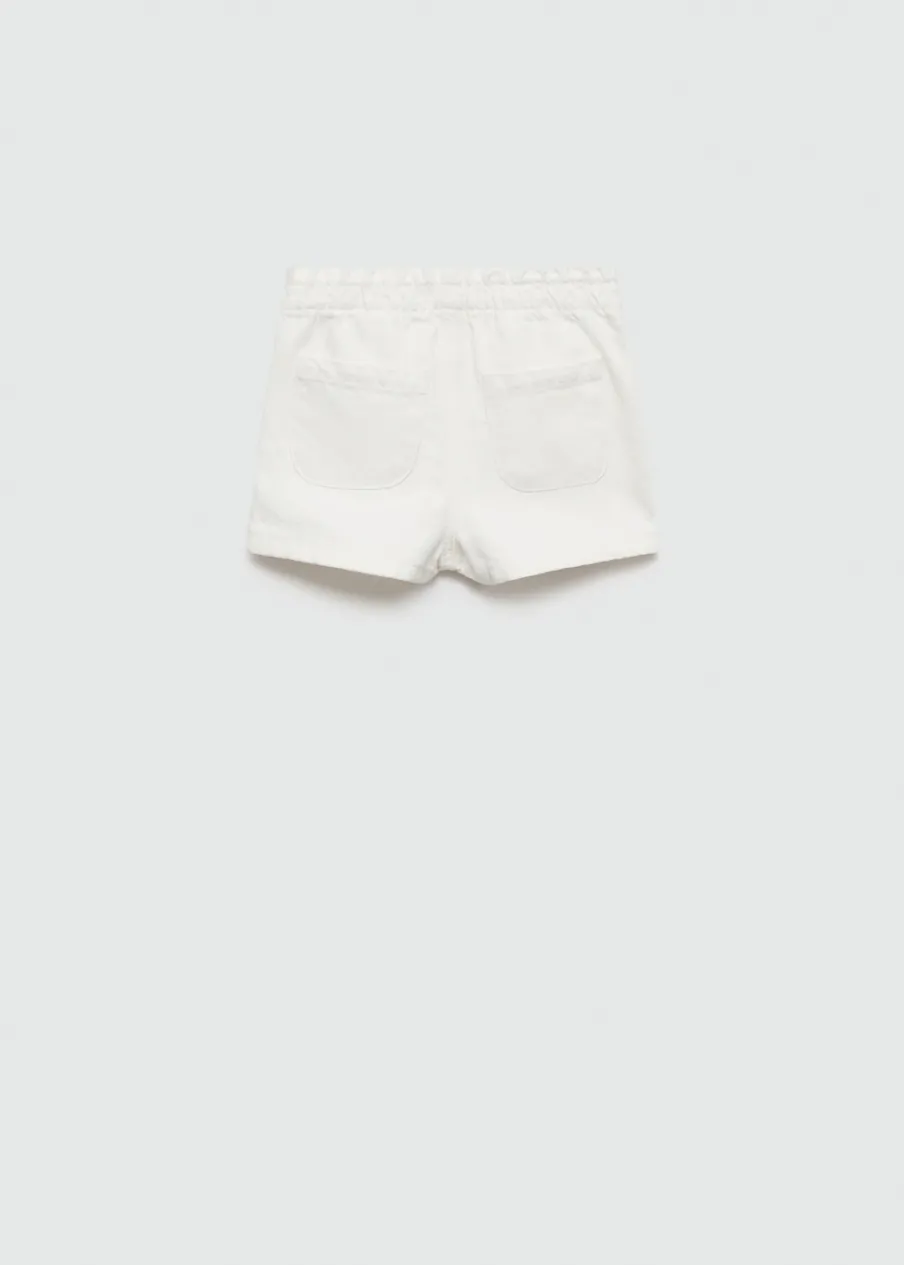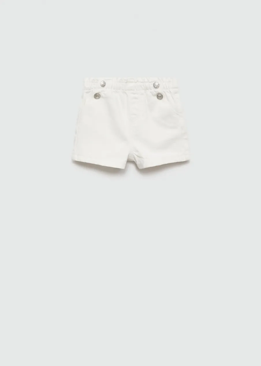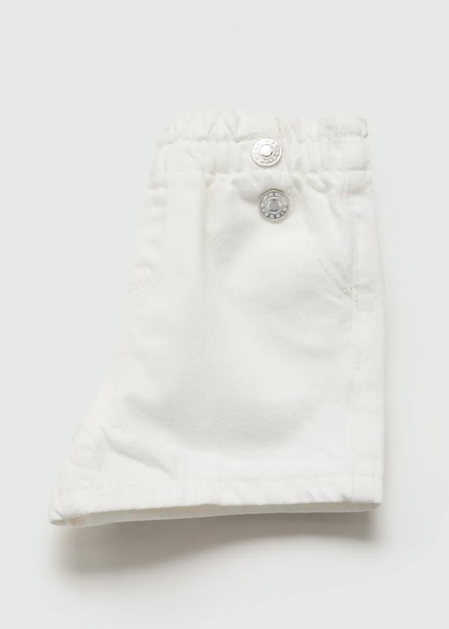 Tkanina bawełniana w dżinsowym stylu. Model prosty. Krótki krój. Elastyczny pas. Ozdobne guziki. Paperbag. Dwie kieszenie nakładane z tyłu. Zapięcie na zatrzaskowe guziki. Obóz letni.