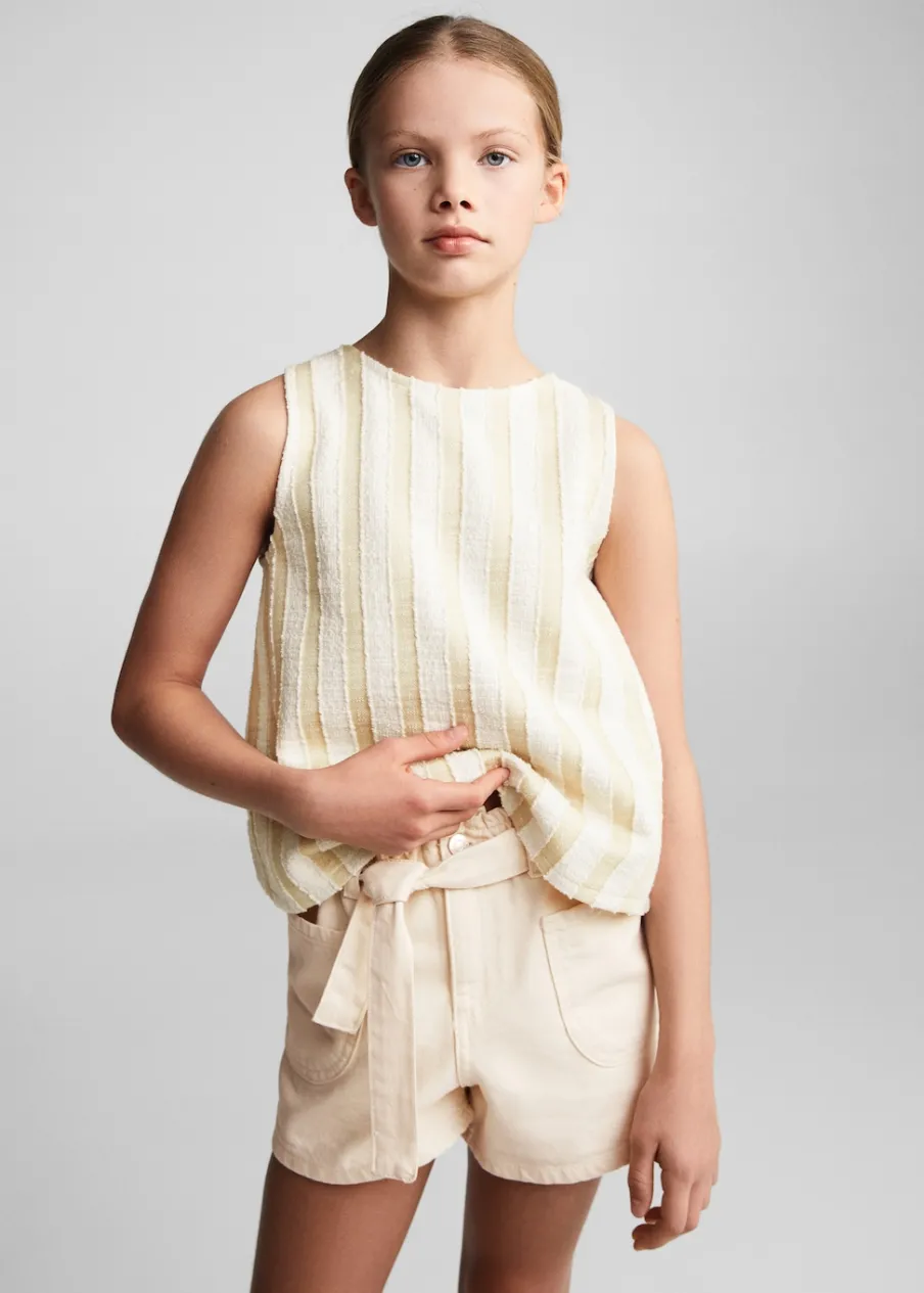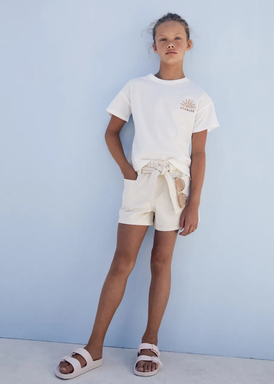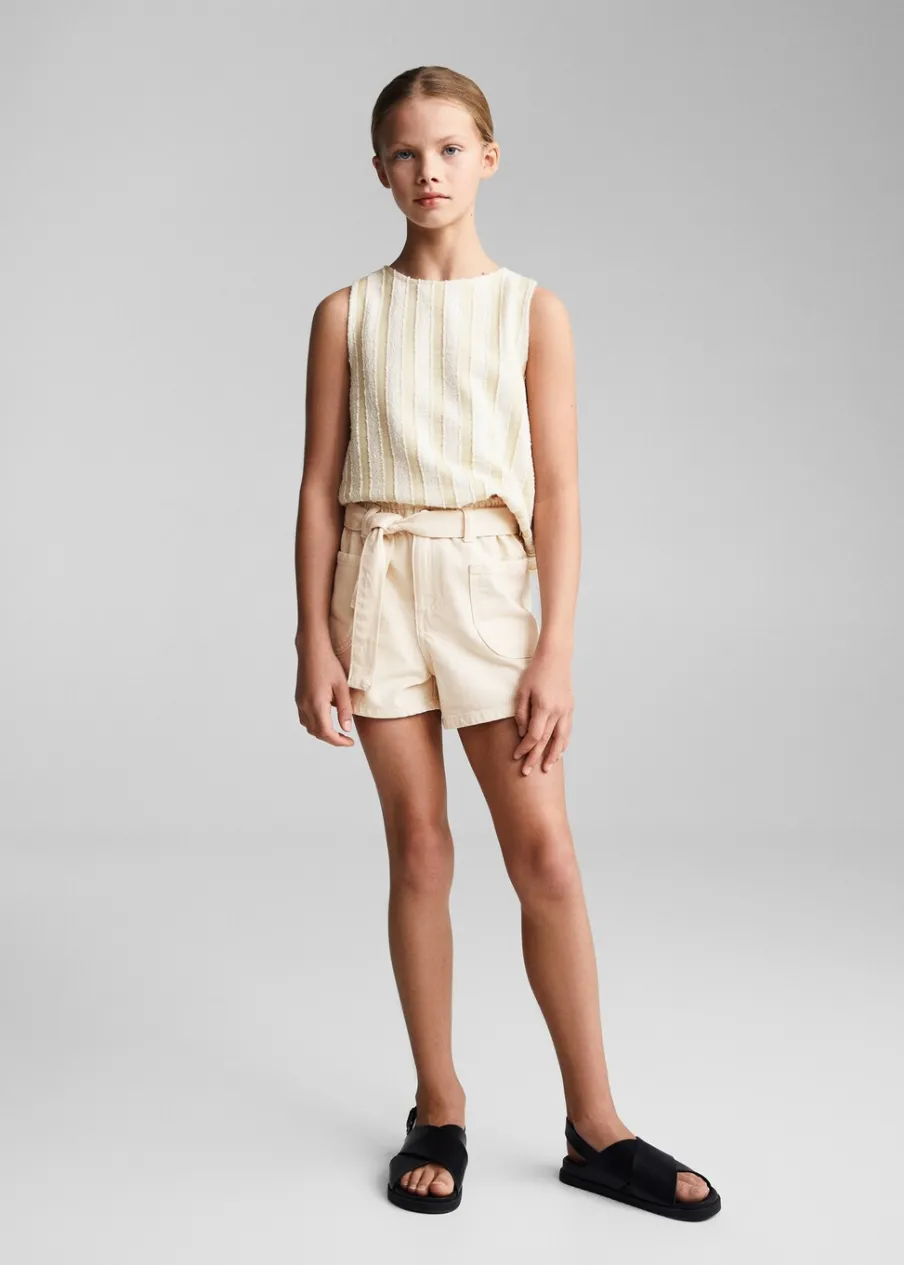 Tkanina bawełniana w dżinsowym stylu. Paperbag. Krótki krój. Regulowany pasek. Dwie kieszenie z przodu. Dwie kieszenie nakładane z tyłu. Zapięcie na suwak i guzik. Obóz letni.