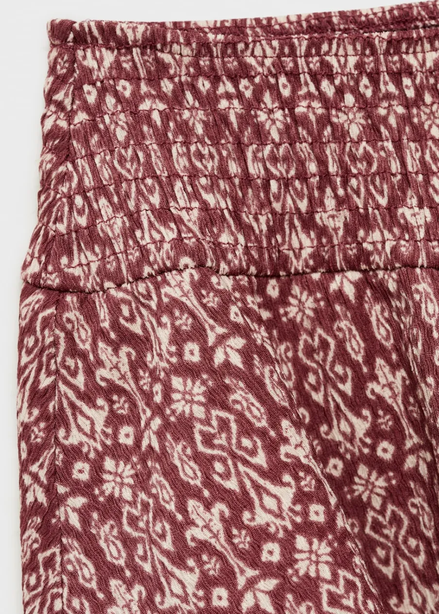 OpisKrótki krój. Wzorzysty. Model z falbankami. Ozdobne marszczenie. Elastyczny pas. Bez zapięcia.