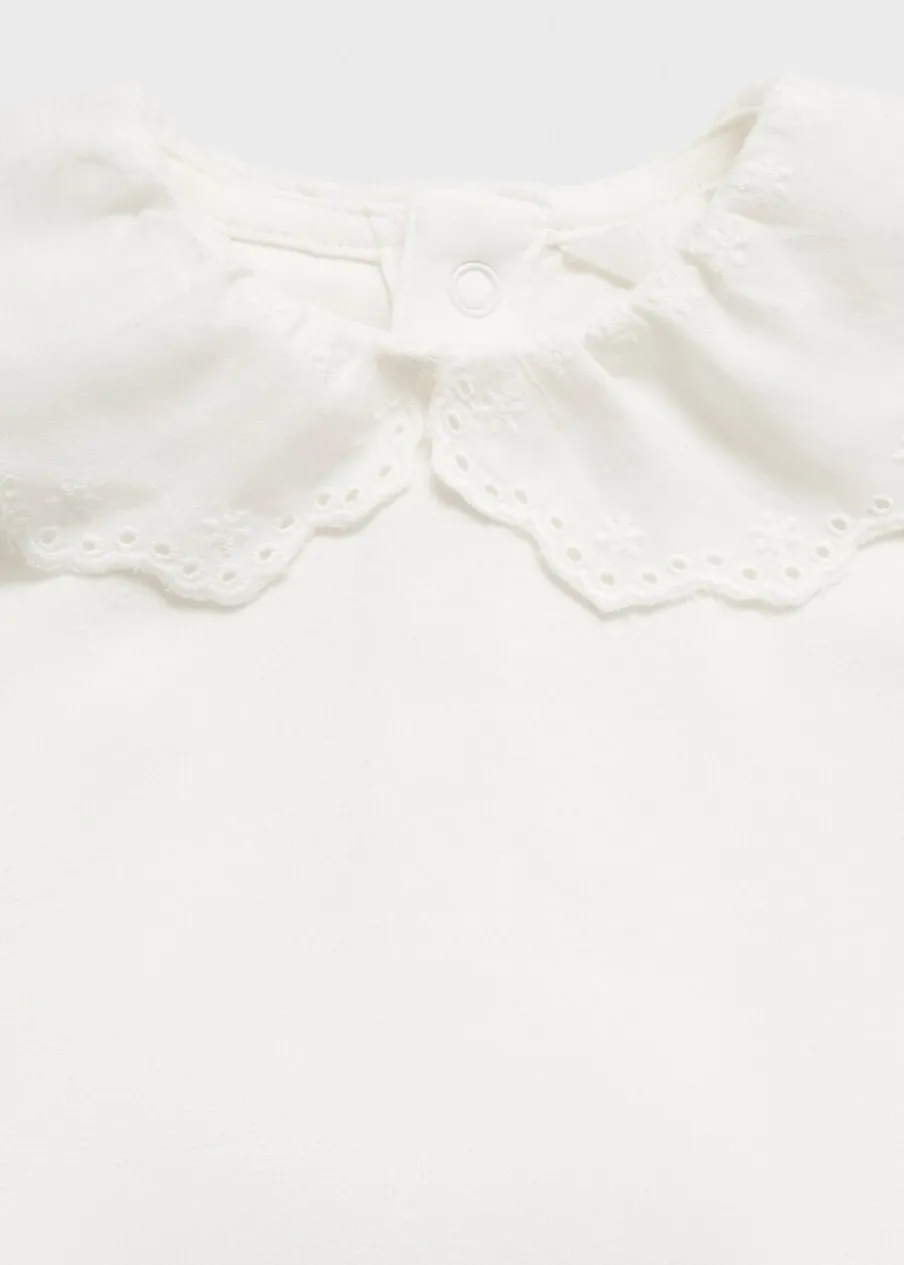 Tkanina z bawełną. Model prosty. Kołnierzyk bebe. Ozdobny haft na kołnierzyku. Długi rękaw. Zapięcie z tyłu na zatrzaskowe guziki.