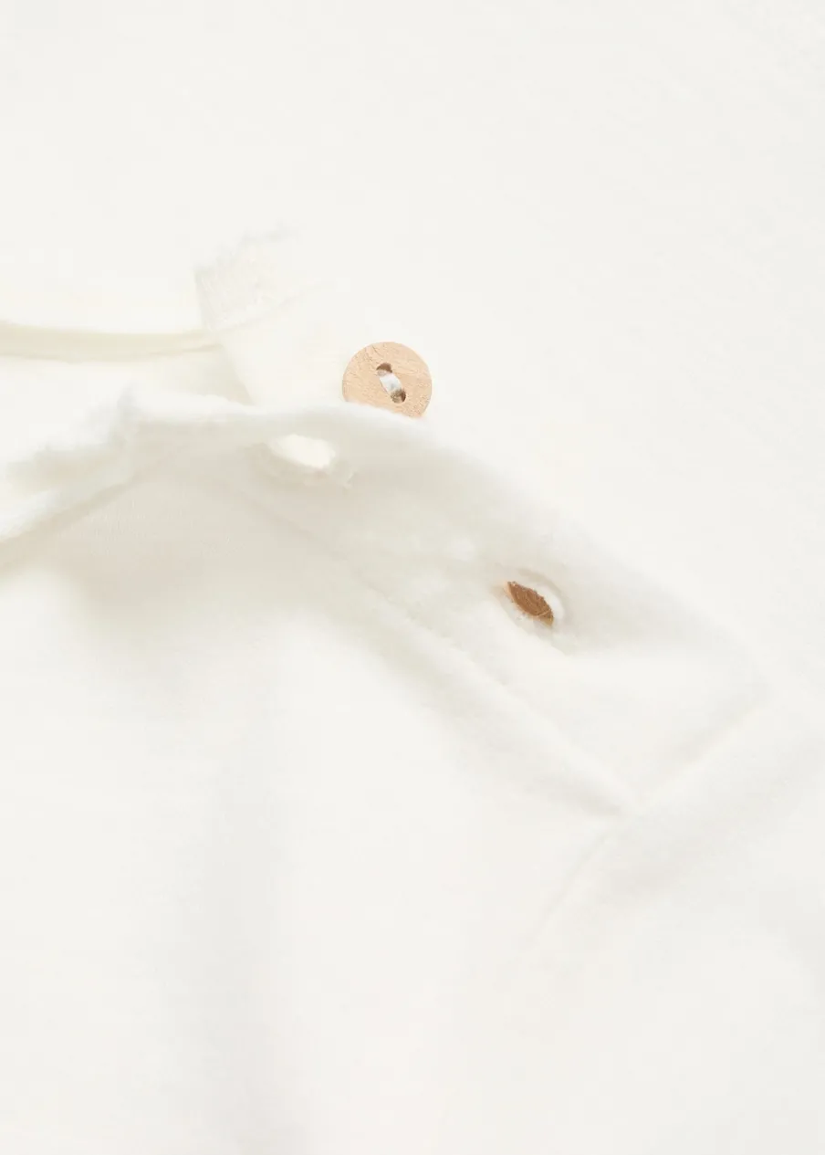 Bawełna 100%. Haftowany detal. Model prosty. Zapięcie na boczne guziki. Długi rękaw. Okrągły dekolt.