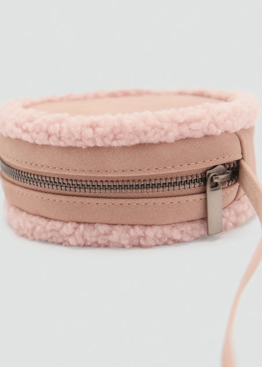 OpisOzdobny kożuch. Okrągły kształt. Długi uchwyt. Zapięcie na suwak.