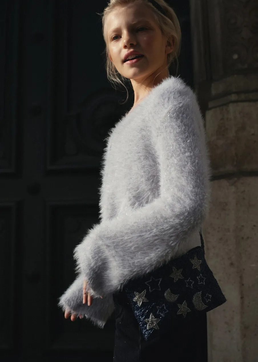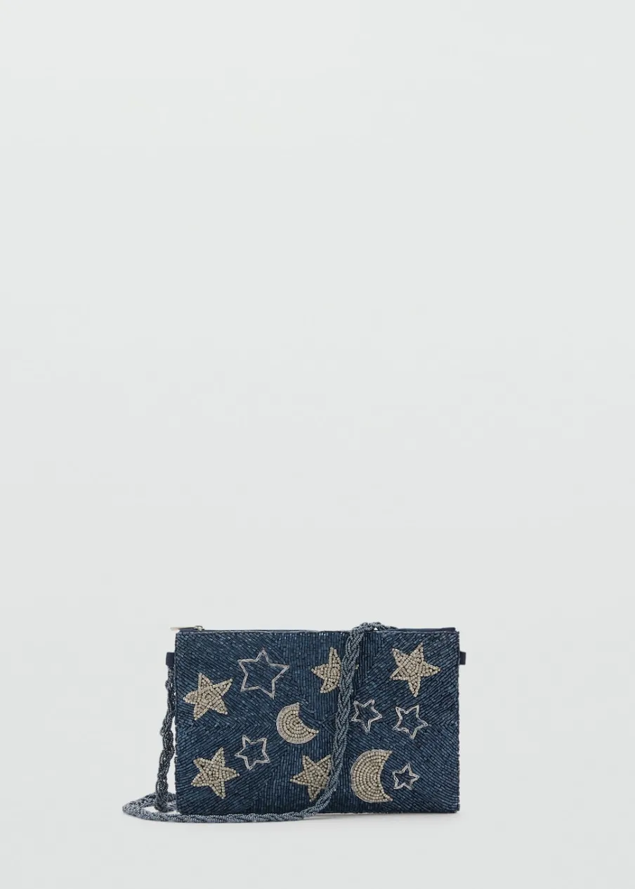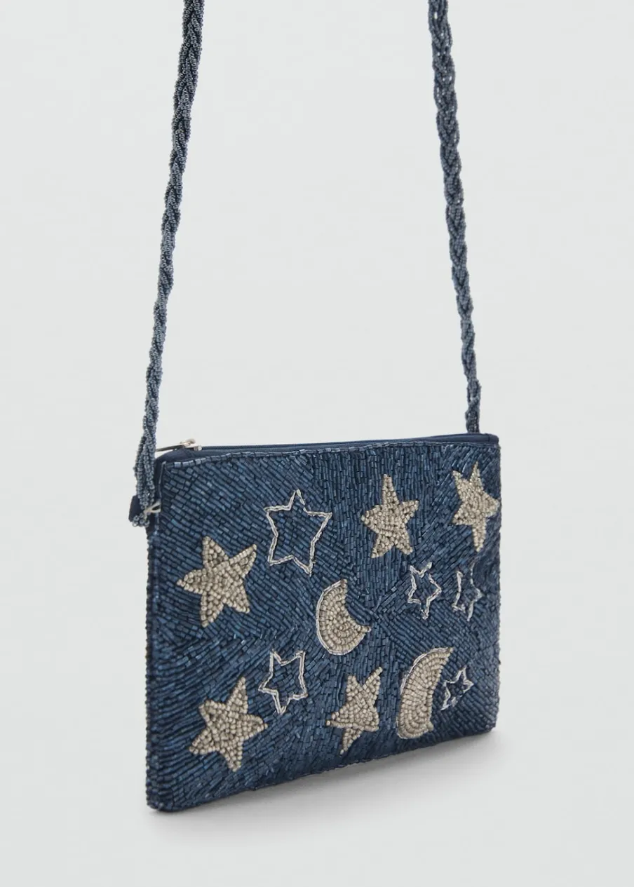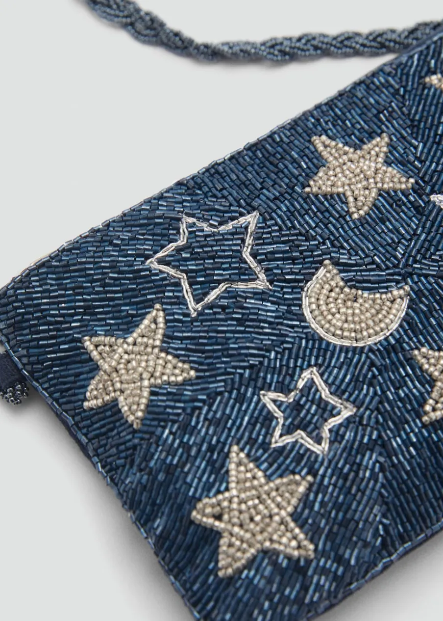 OpisOzdobne koraliki. Deseń w gwiazdki. Kształt księżyca. Długi uchwyt. Zapięcie na suwak.