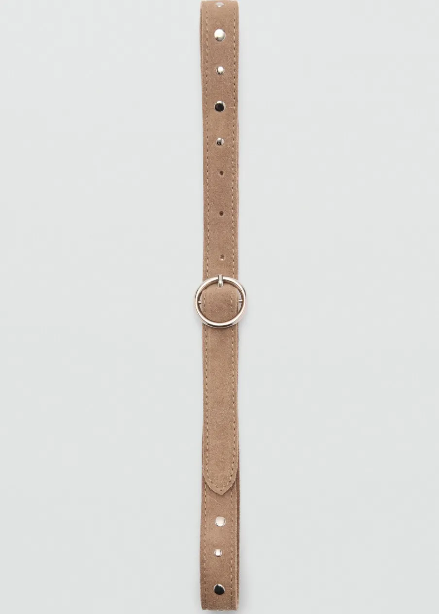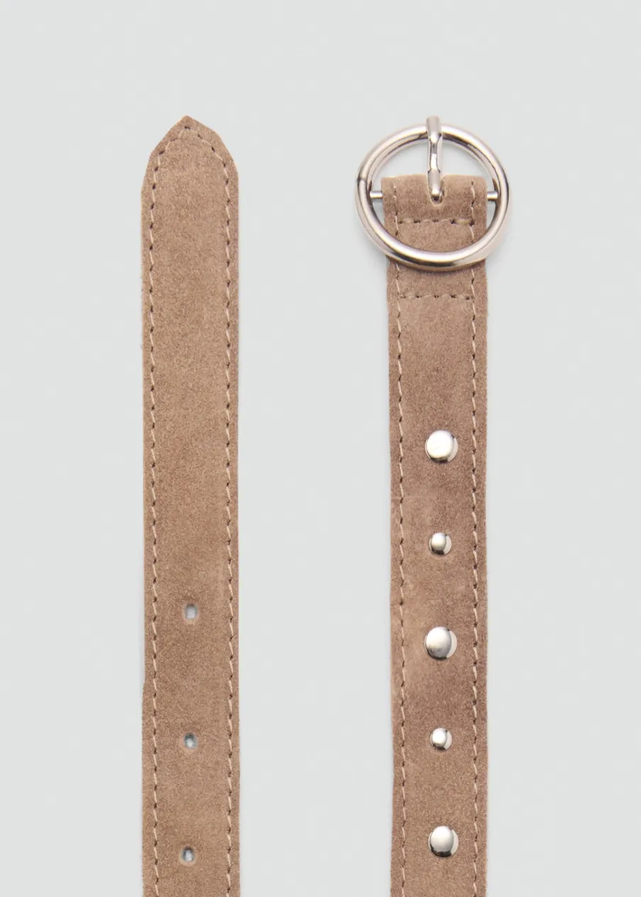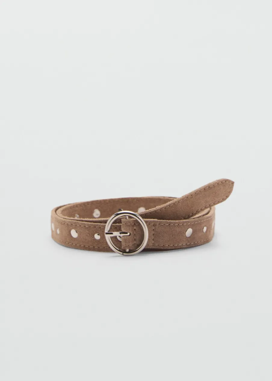 100% skóra. Detal z ćwiekami. Perforowany wzór. Zapięcie na klamrę. Okrągła klamra.