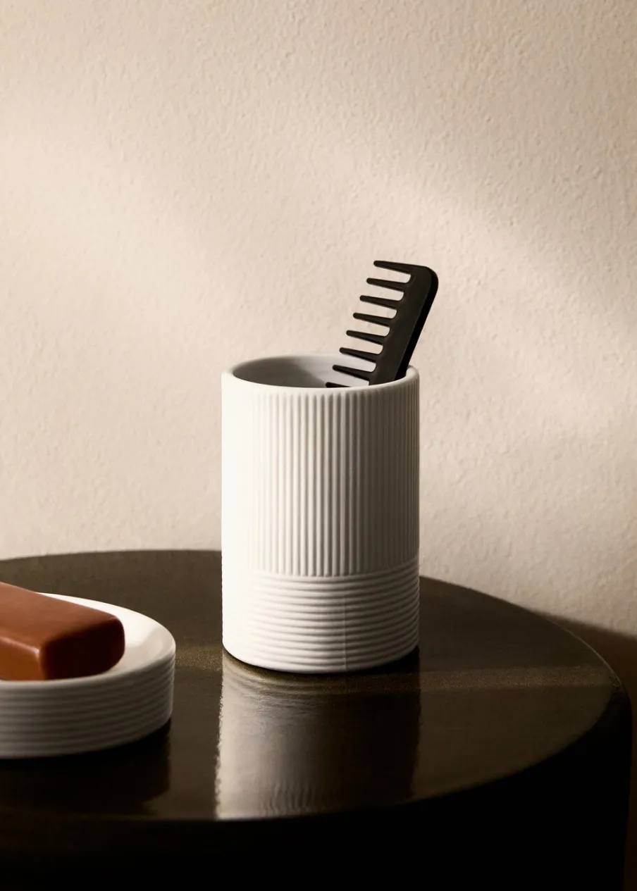 Pojemnik na szczoteczki do łazienki. 100% kamionka. Model wypukły. Tworzy ciepłą i przyjemną atmosferę. Pasuje do innych artykułów z kolekcji.