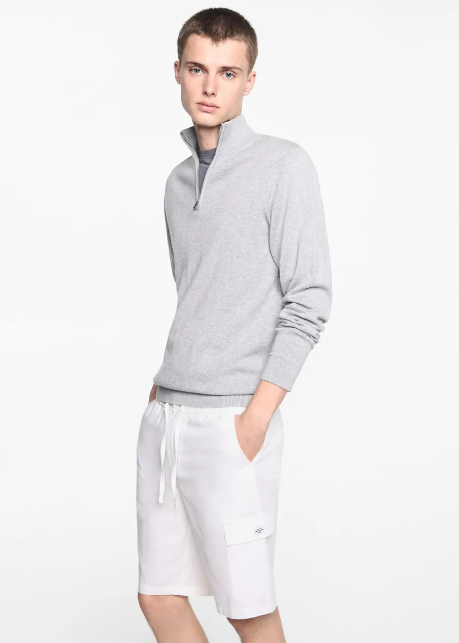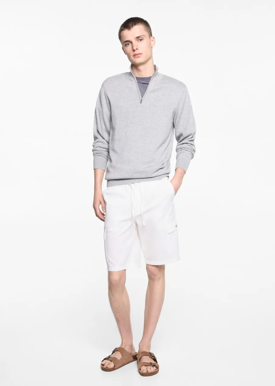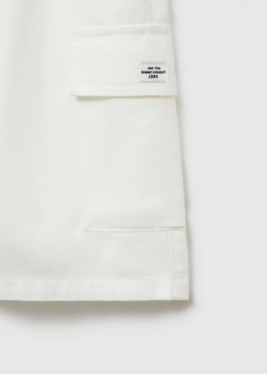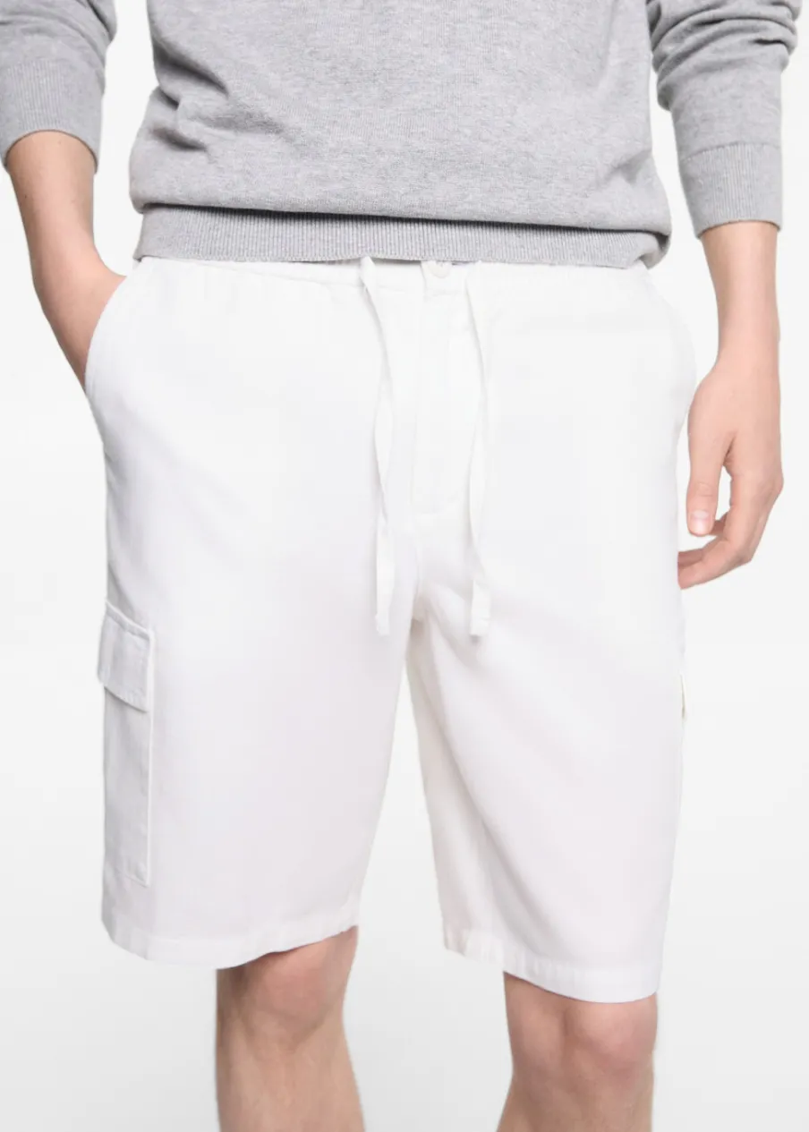 Tkanina mieszanka bawełny i lnu. Model prosty. Krótki krój. Elastyczny pas. Dwie kieszenie cargo. Wiązanie na sznurek.