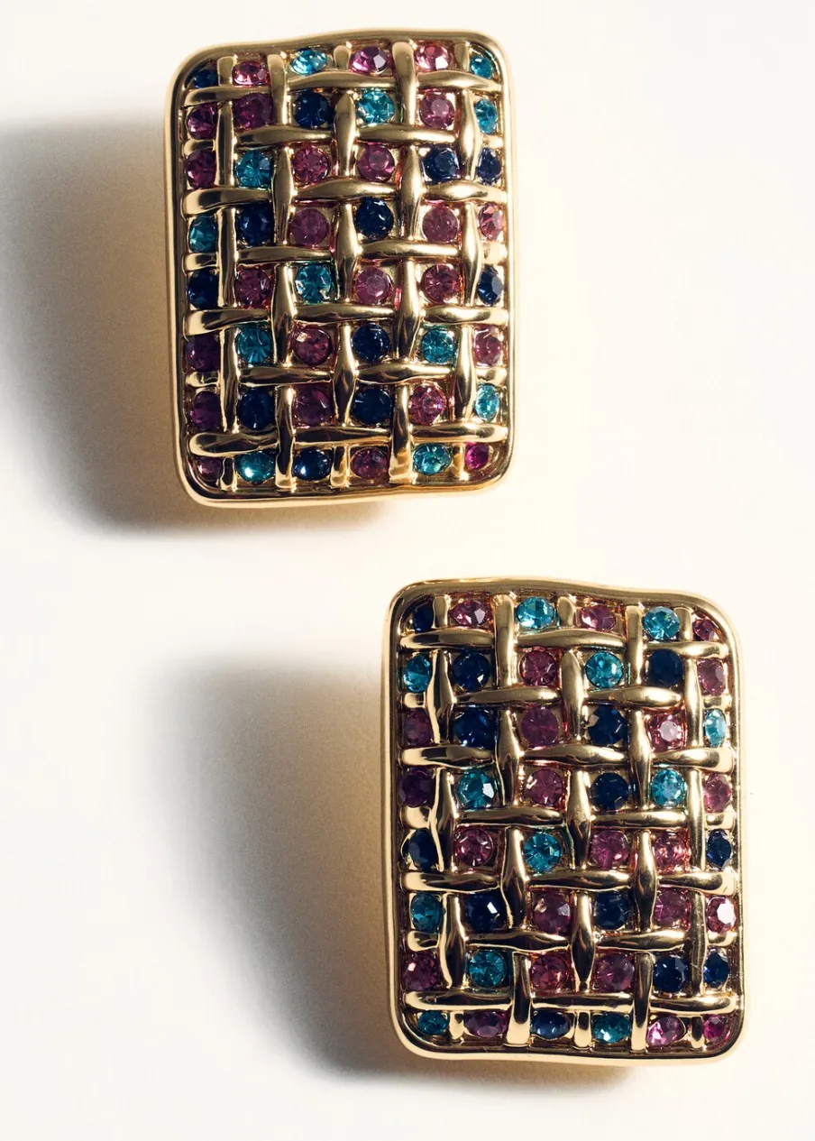 Geometryczny deseń. Prostokątny kształt. Łączone materiały ze szklanymi elementami. Połączenie różnych koralików. Metalowe zapięcie na zatrzask.