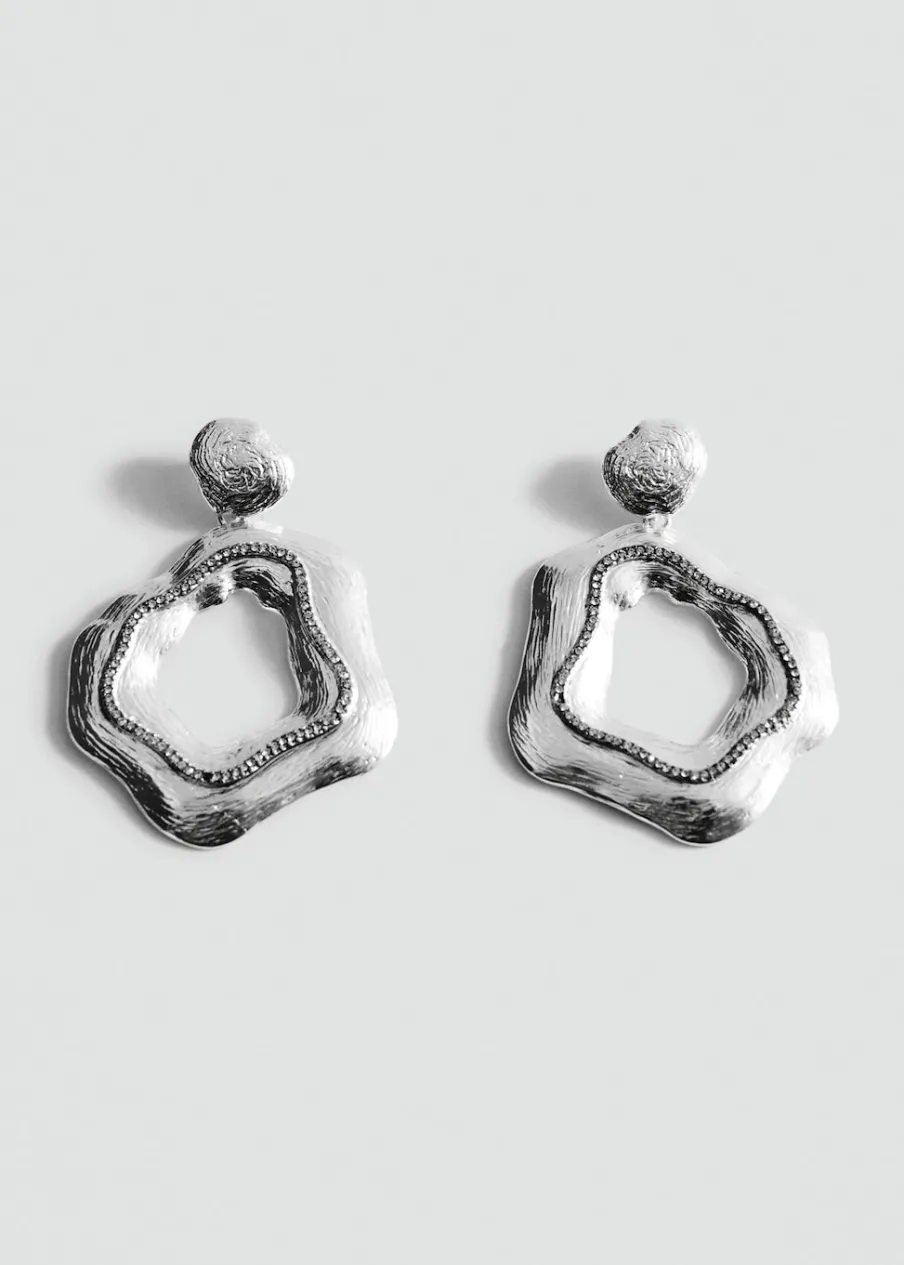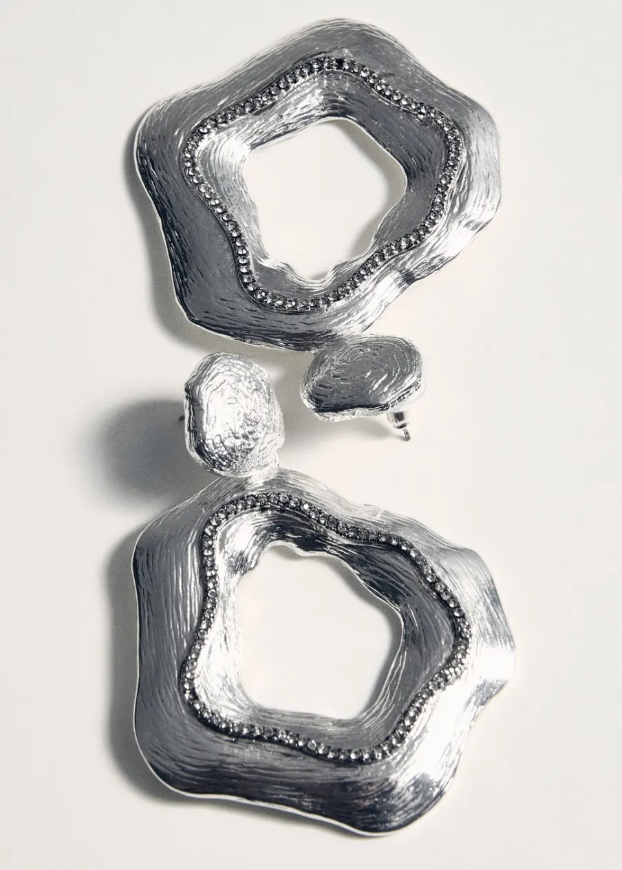 Okrągły kształt. Nieregularny kształt. Teksturowane wykończenie. Ozdobne kryształki. Metalowe zapięcie na zatrzask.