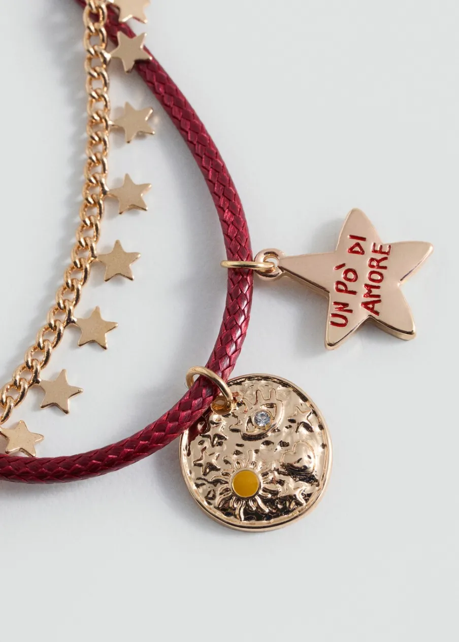 OpisBarwione nici. Cienkie łańcuszki. Wisiory gwiazdki. Zawieszka z napisem. Zapięcie na łańcuszek i karabińczyk.