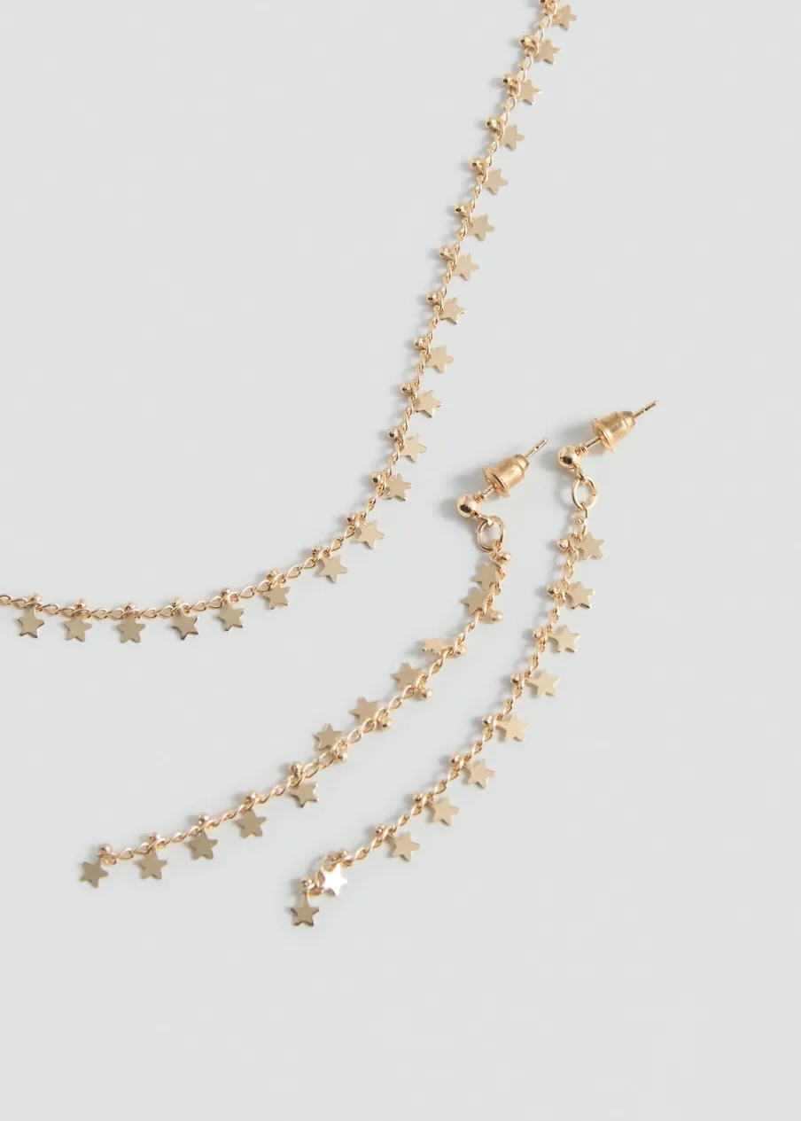 W formie łańcucha. Zdobienie w gwiazdki. Zapięcie na łańcuszek i karabińczyk. Długie kolczyki. Metalowe zapięcie na zatrzask.
