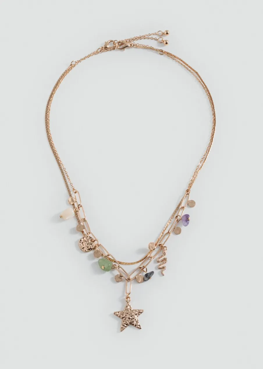 Struktura z metalu. Cienkie łańcuszki. Zawieszka moneta. Wisior w kształcie gwiazdy. Połączenie różnych koralików. Zapięcie na łańcuszek i karabińczyk.