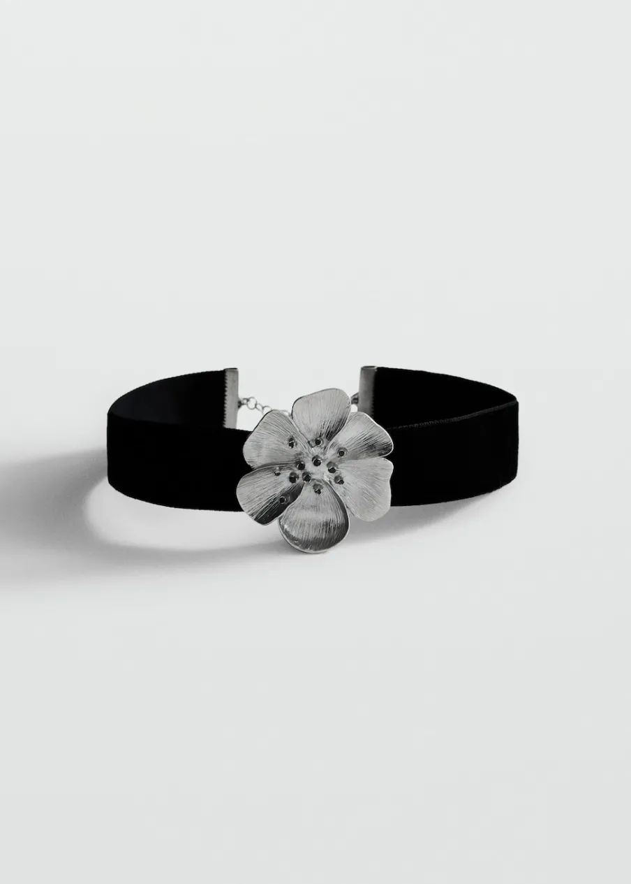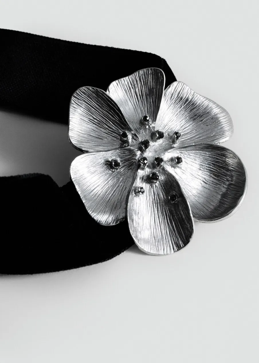 W stylu choker. Detal ze szlifowanych kryształków. Zapięcie na łańcuszek i karabińczyk. Regulowane zapięcie. Kwiatowa ozdoba. Kolekcja wizytowa.