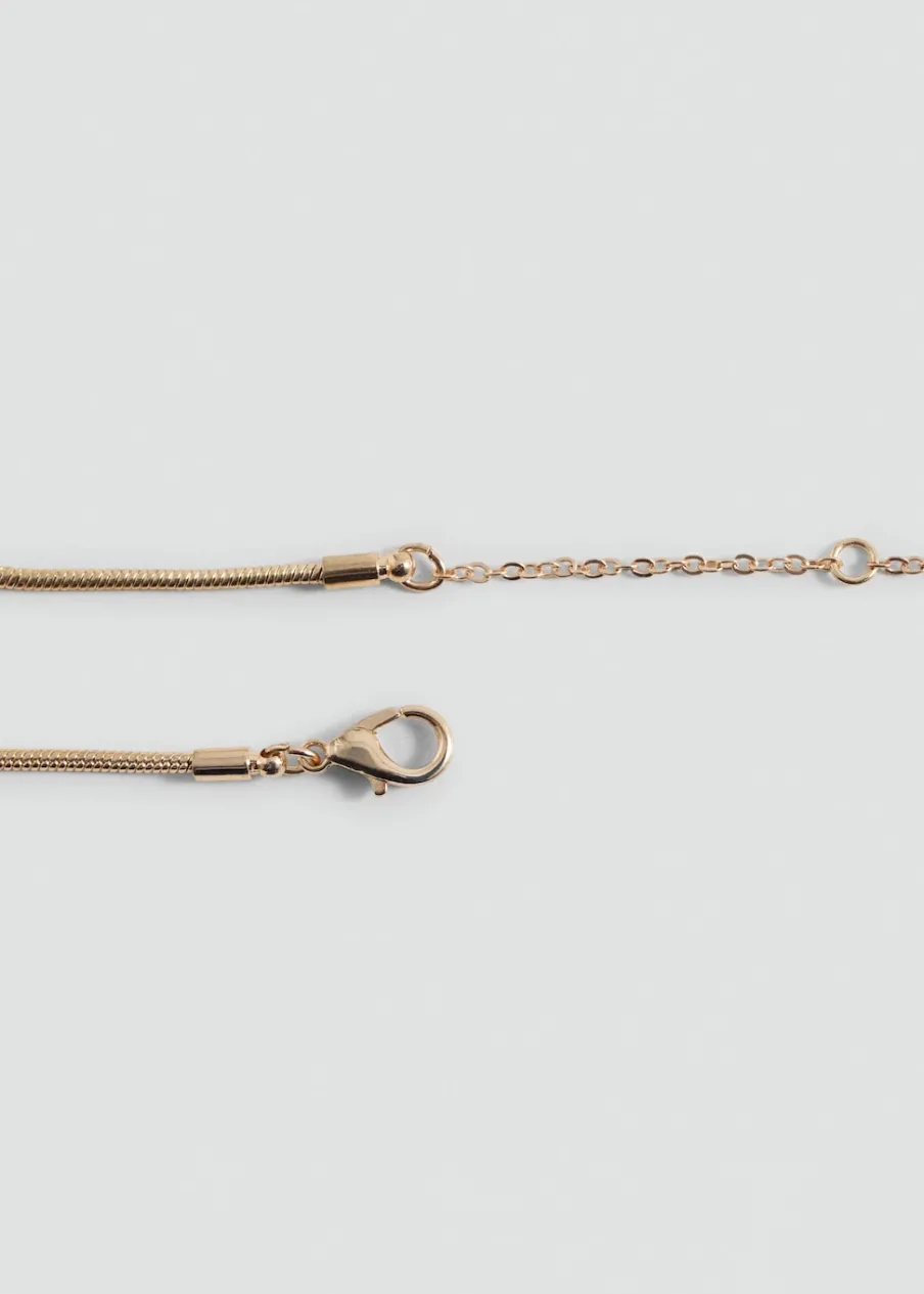 Cienki, metalowy łańcuszek. Metalowe koraliki. Zapięcie na karabińczyk.