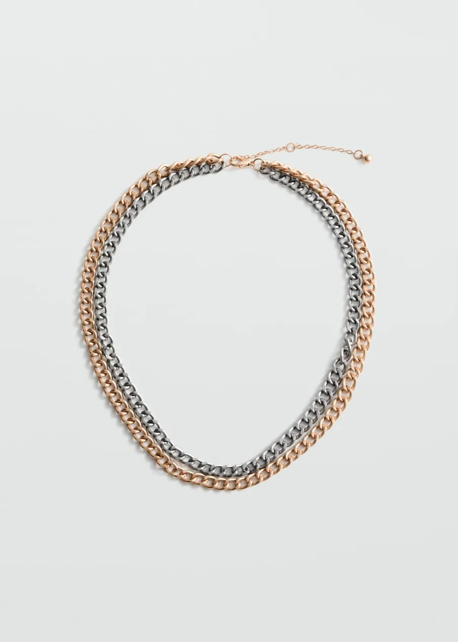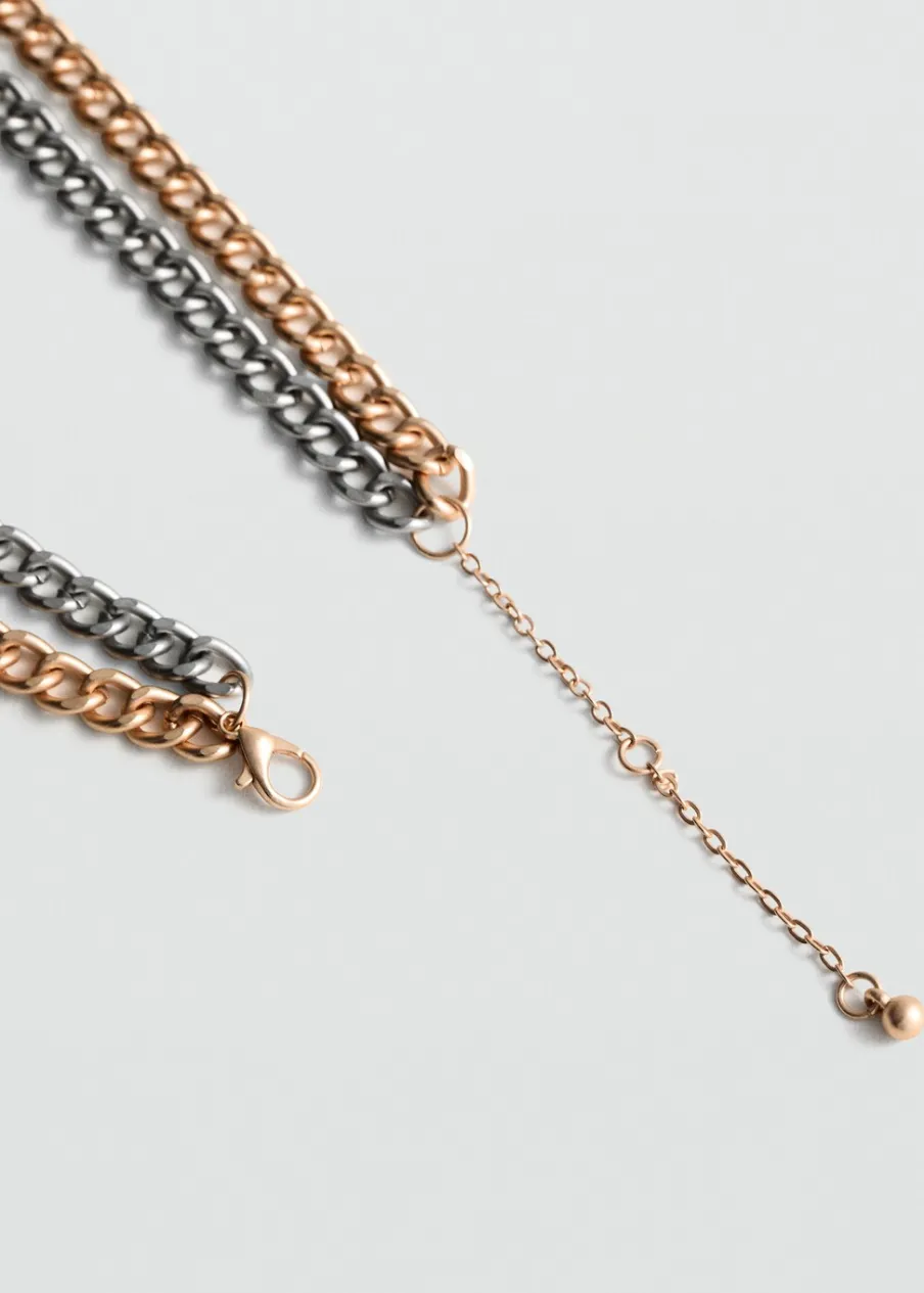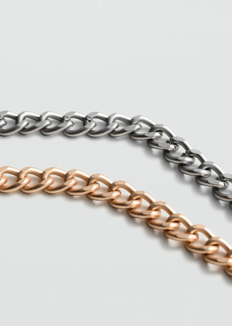 W formie łańcucha. Pleciona konstrukcja. Podwójny łańcuch. Zapięcie na łańcuszek i karabińczyk.