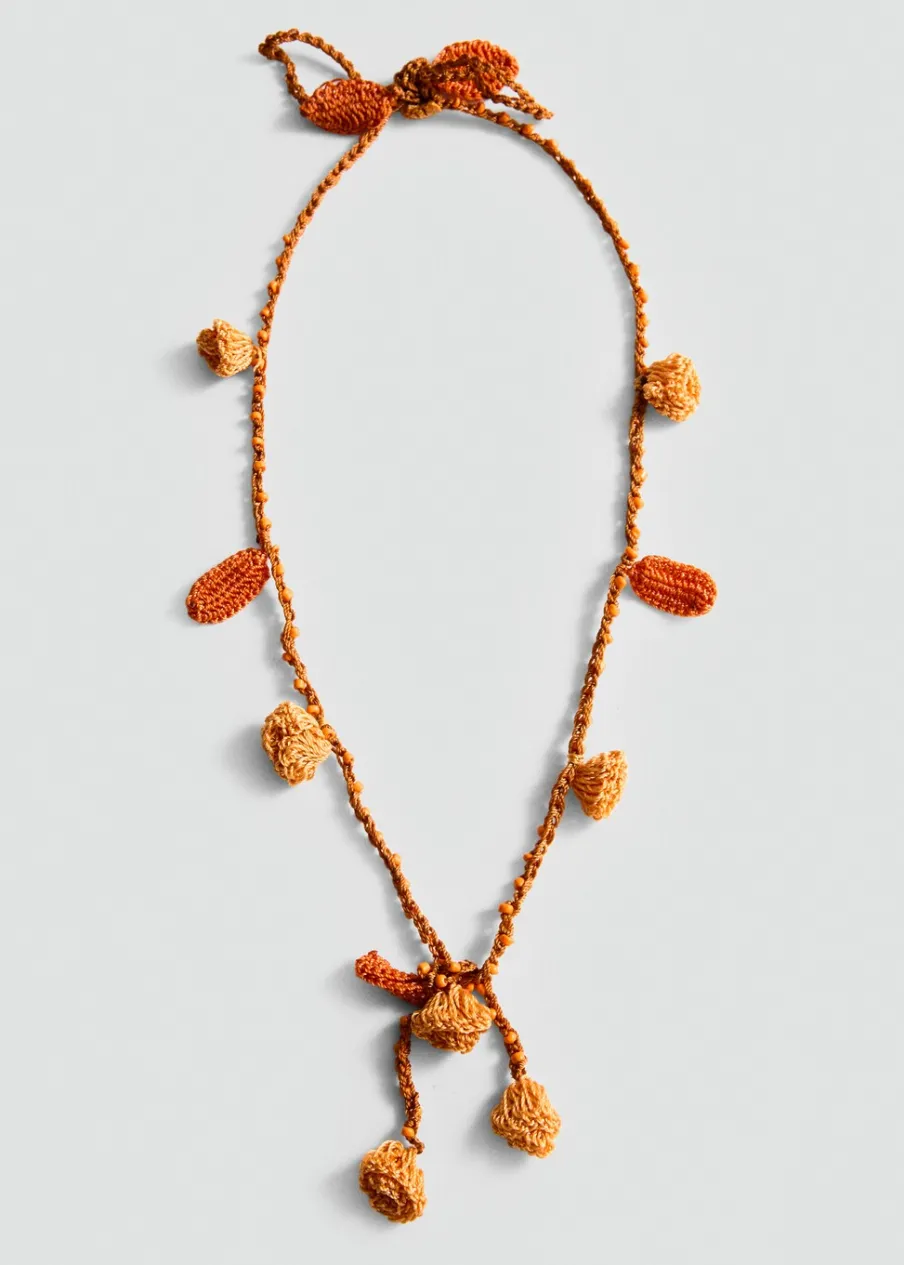 OpisSzydełkowy model. Deseń w kwiaty. Ozdobne koraliki. Zapięcie na węzełek.