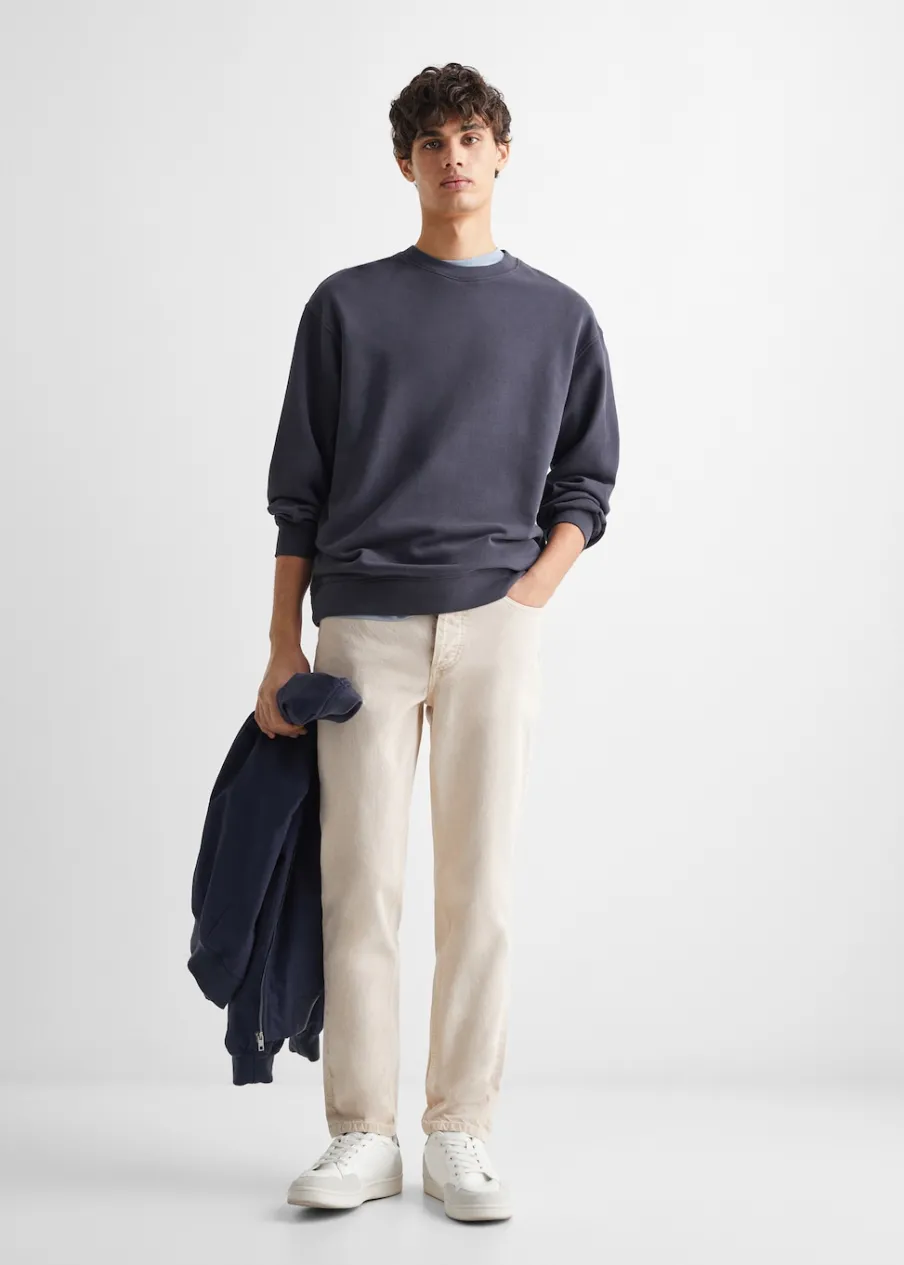 100% βαμβάκι, egyenes szabású modell, hosszabb modell, kerek nyak, hosszú ujj, zár nélkül.