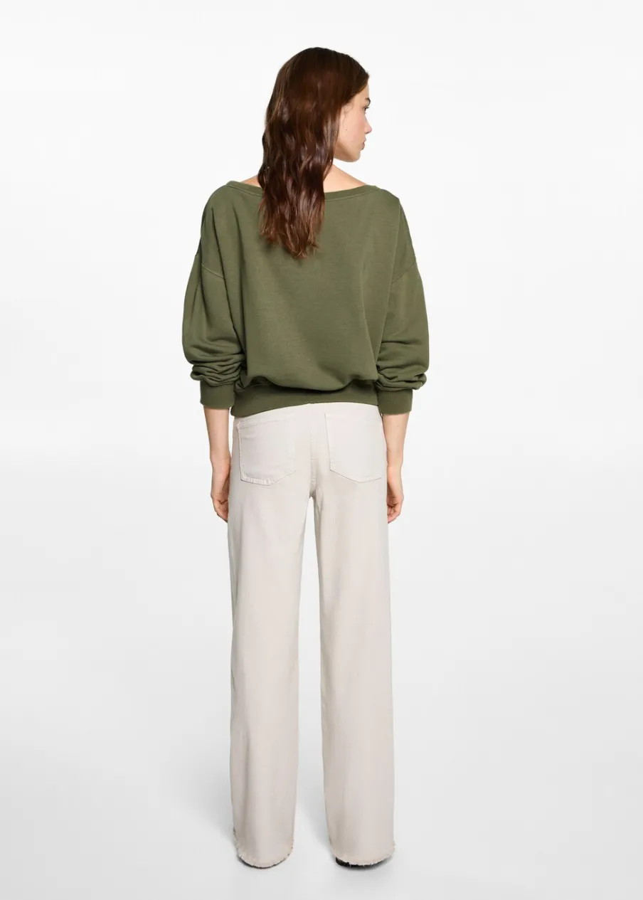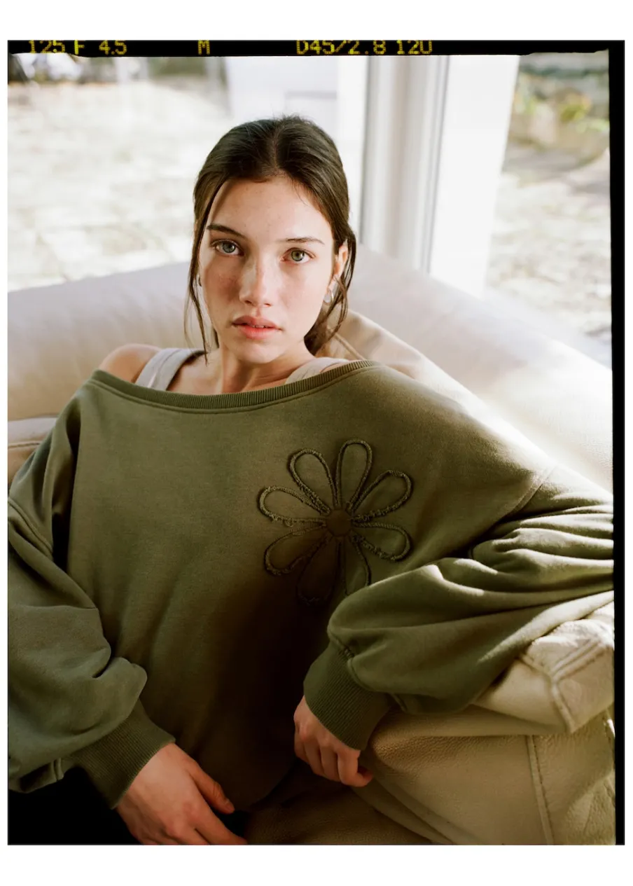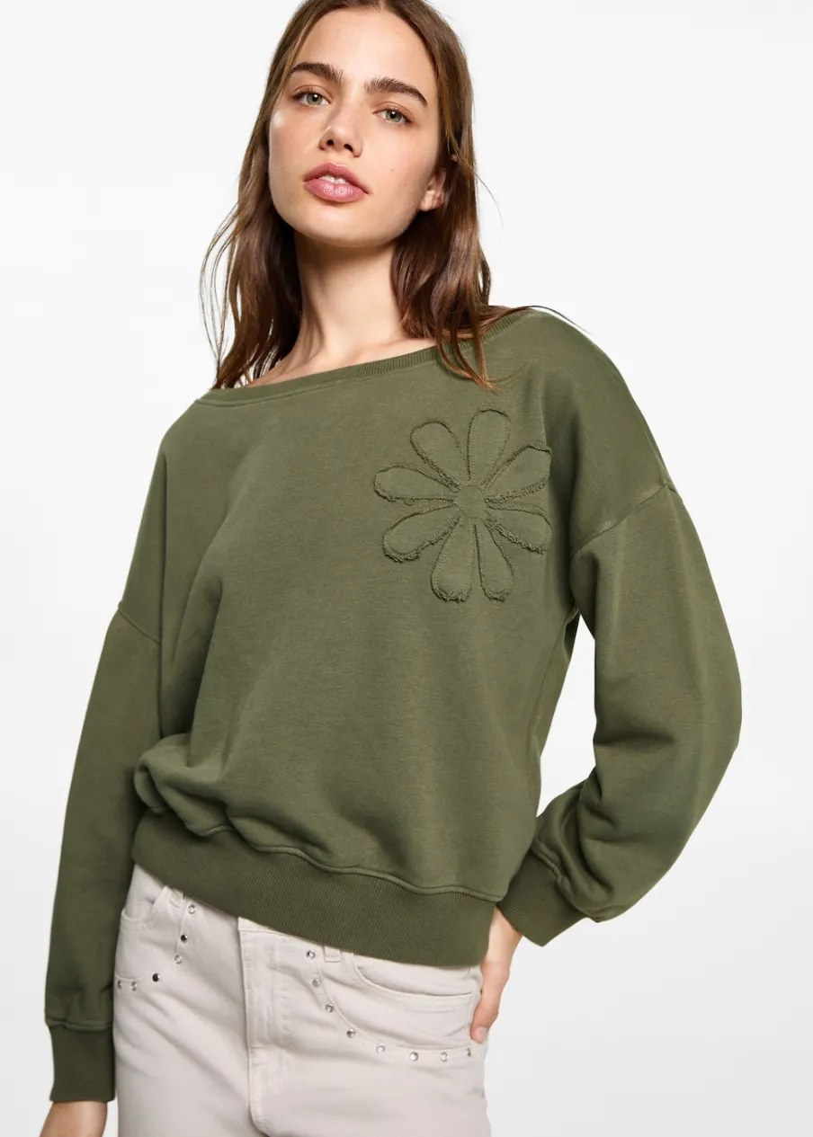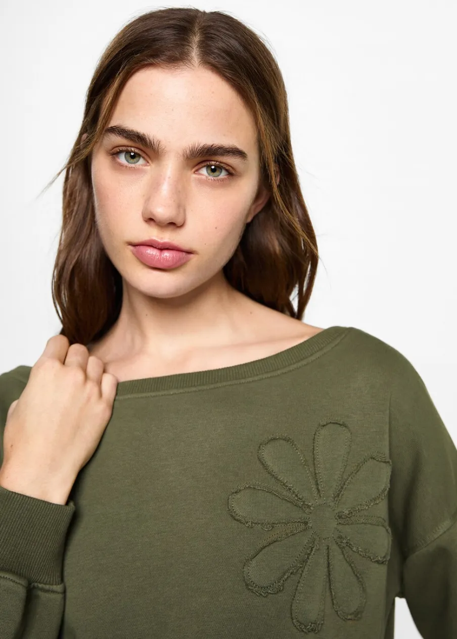 Tkanina z bawełną. Kwiatowy haft. Krój: oversize. Dekolt w kształcie łódki. Długi rękaw. Ściągaczowe wykończenia.