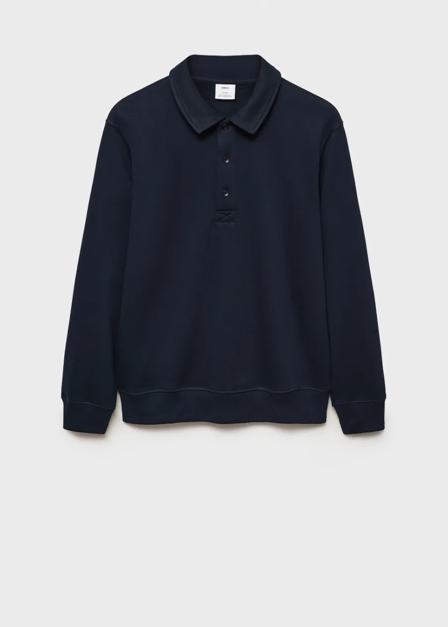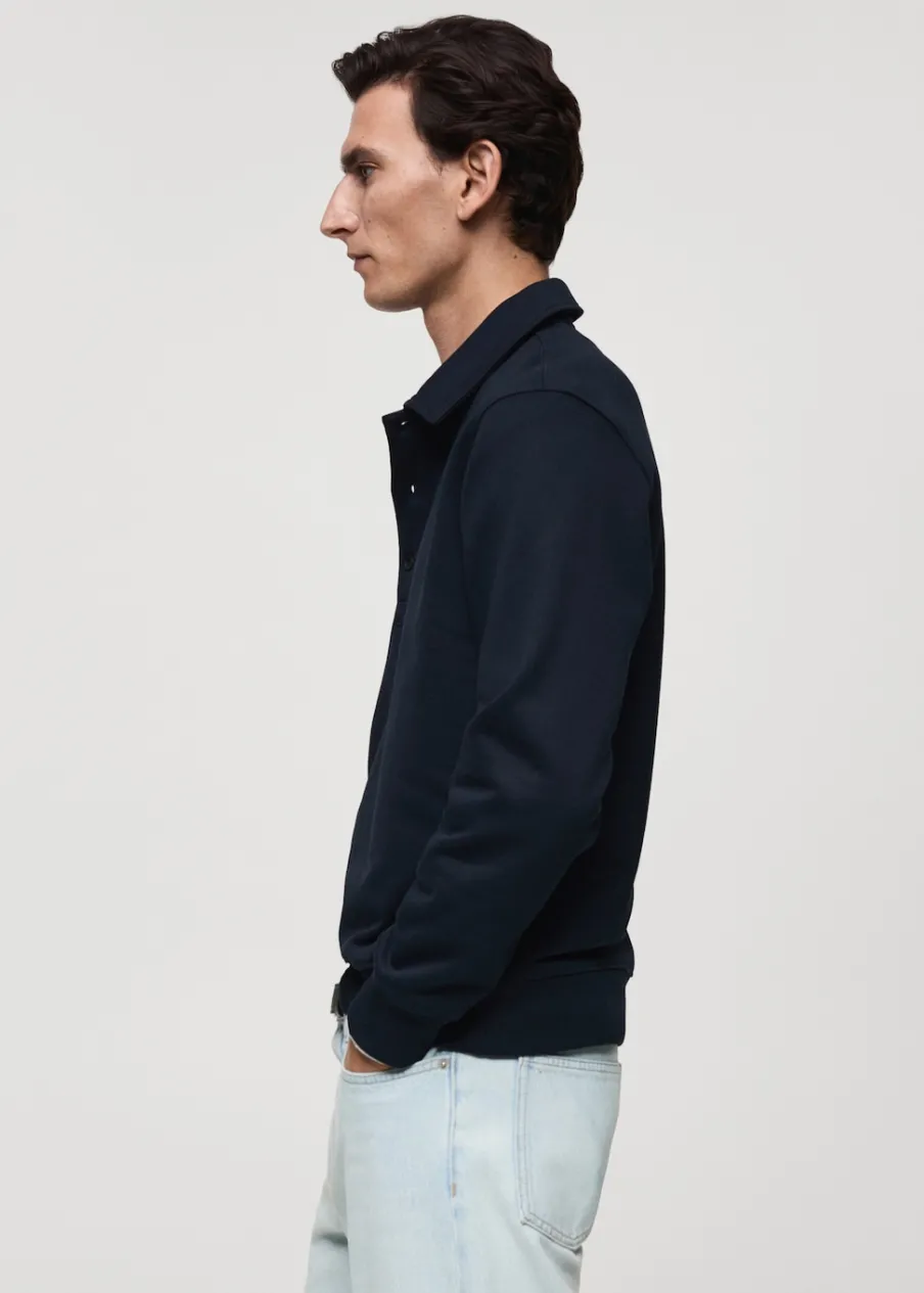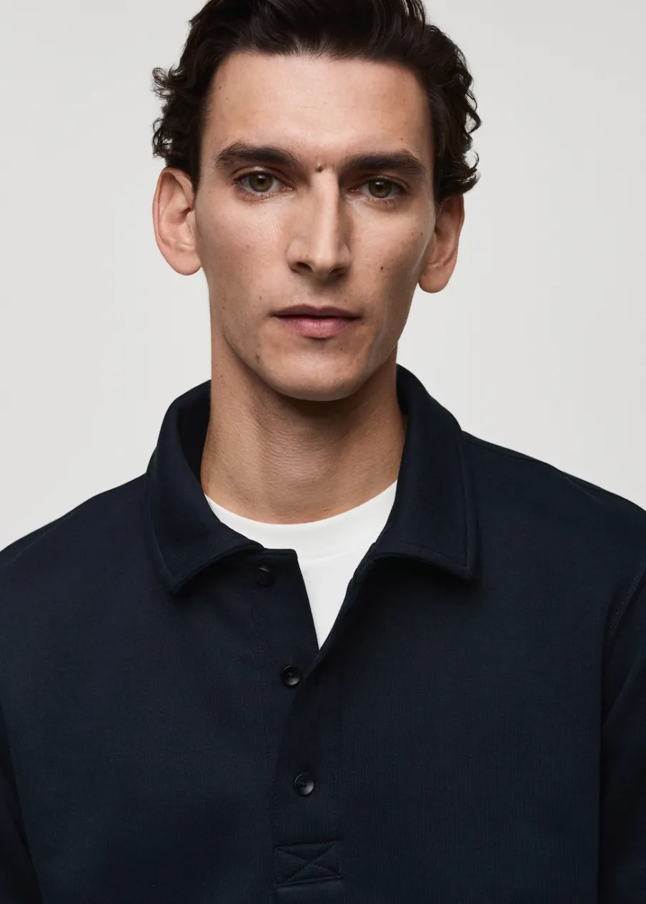 A barna szín kizárólag online elérhető, regular fit, bekevert pamut anyag, melírozott pamut belső, gombbal záródó pólónyak, passzés mandzsetta és alj, a modell testmagassága 185 cm és M-es méretet visel.
