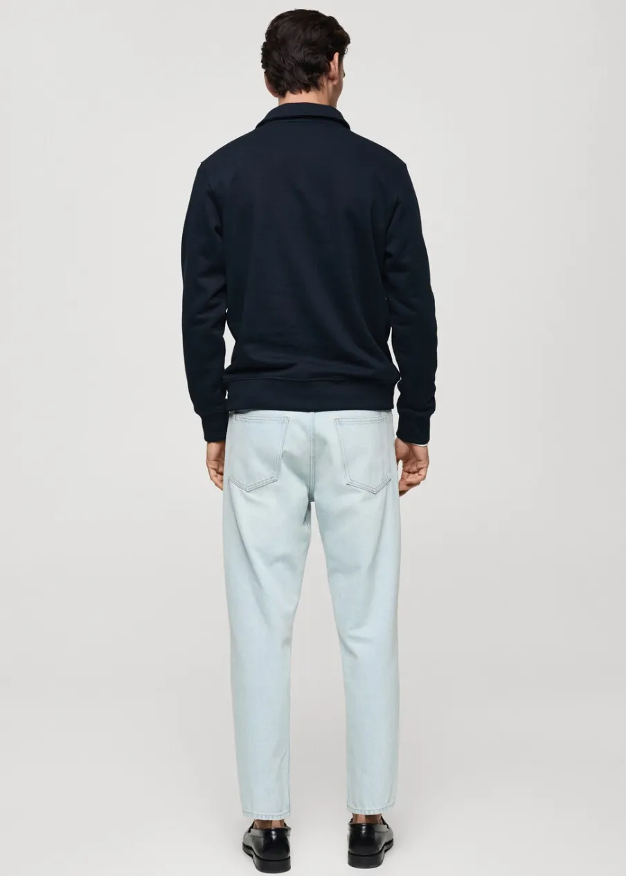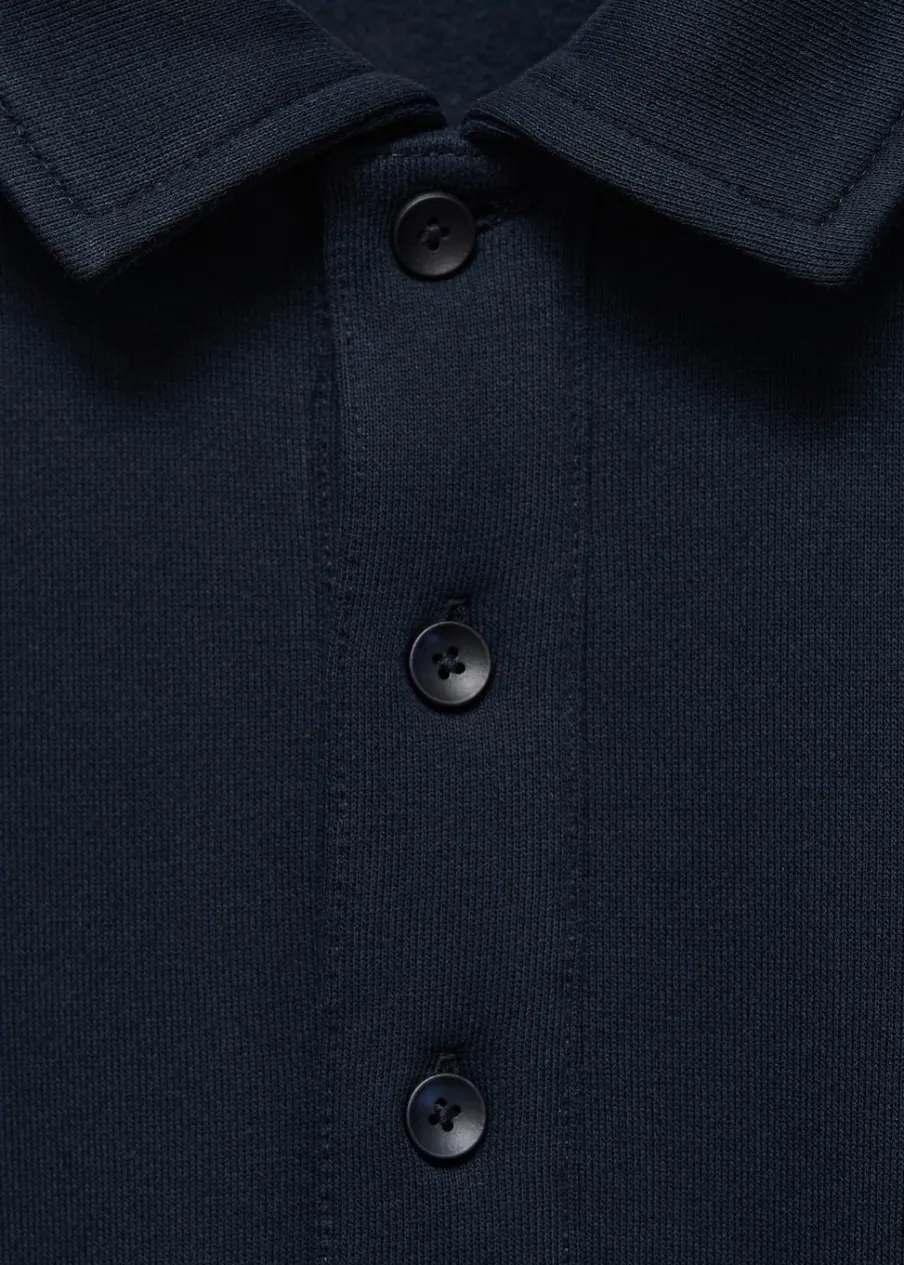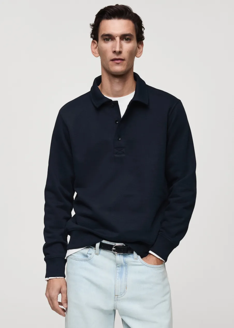 A barna szín kizárólag online elérhető, regular fit, bekevert pamut anyag, melírozott pamut belső, gombbal záródó pólónyak, passzés mandzsetta és alj, a modell testmagassága 185 cm és M-es méretet visel.