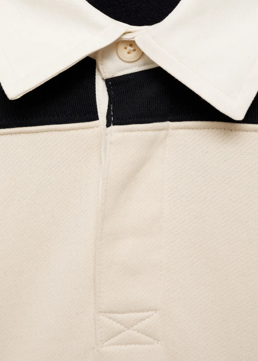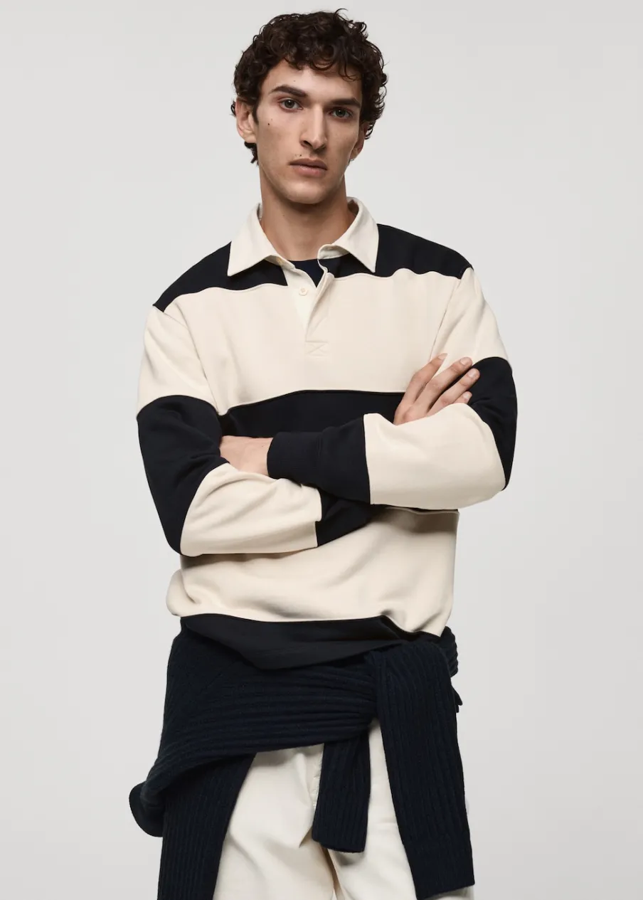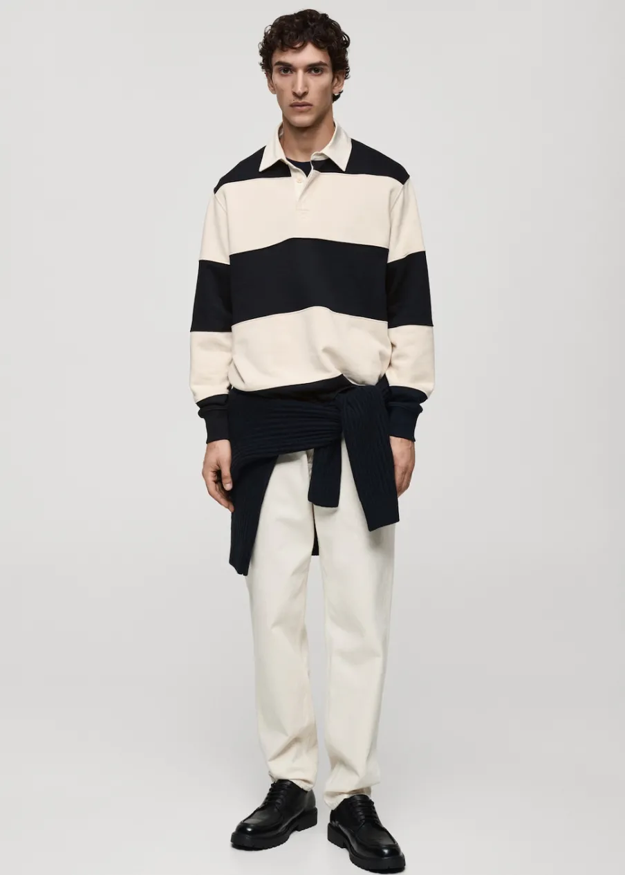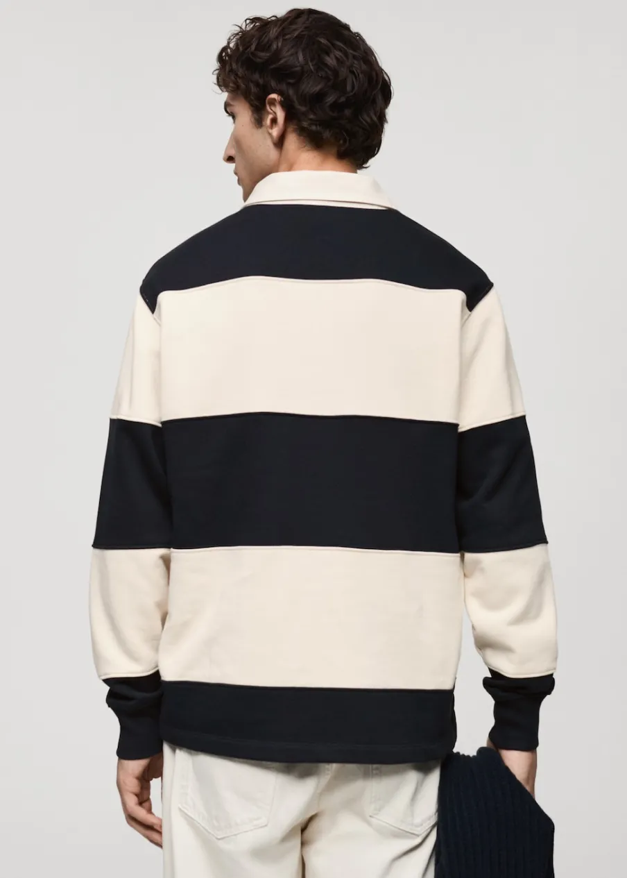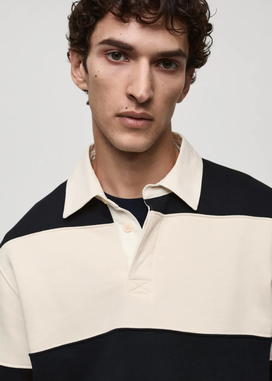 Regular fit, pamut anyag, csíkos minta, póló gallér, bordás végű, a modell testmagassága 185 cm és M-es méretet visel.