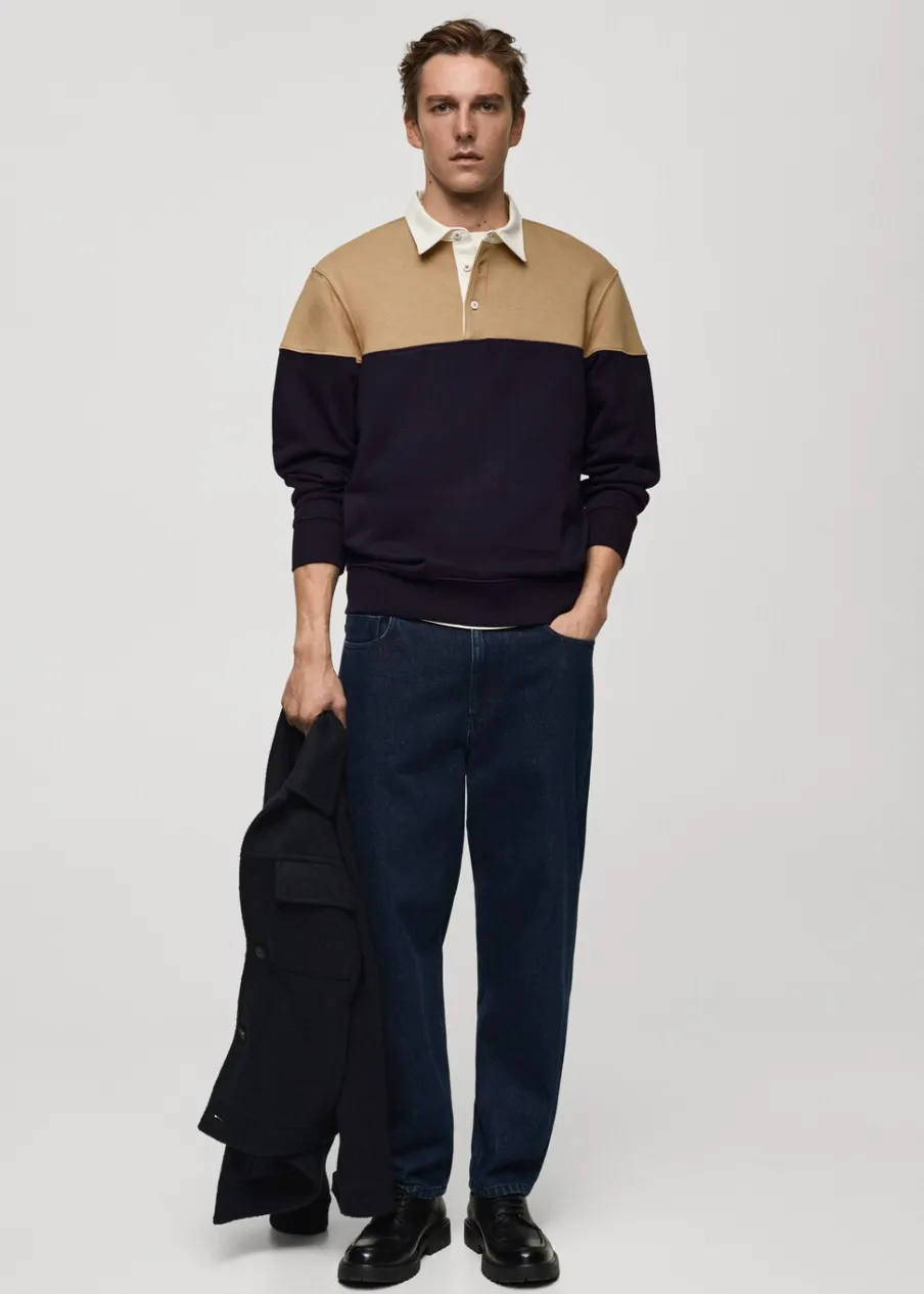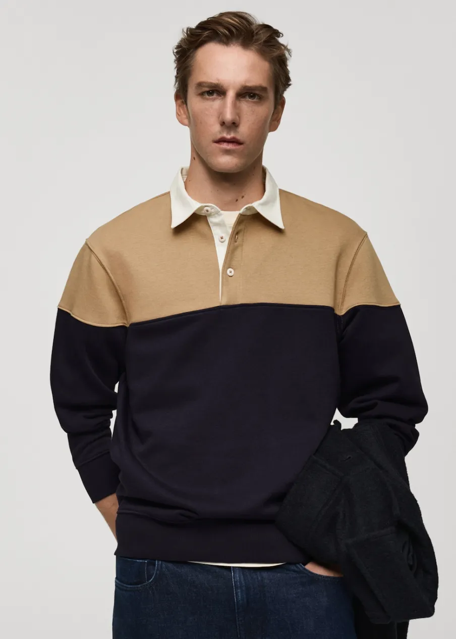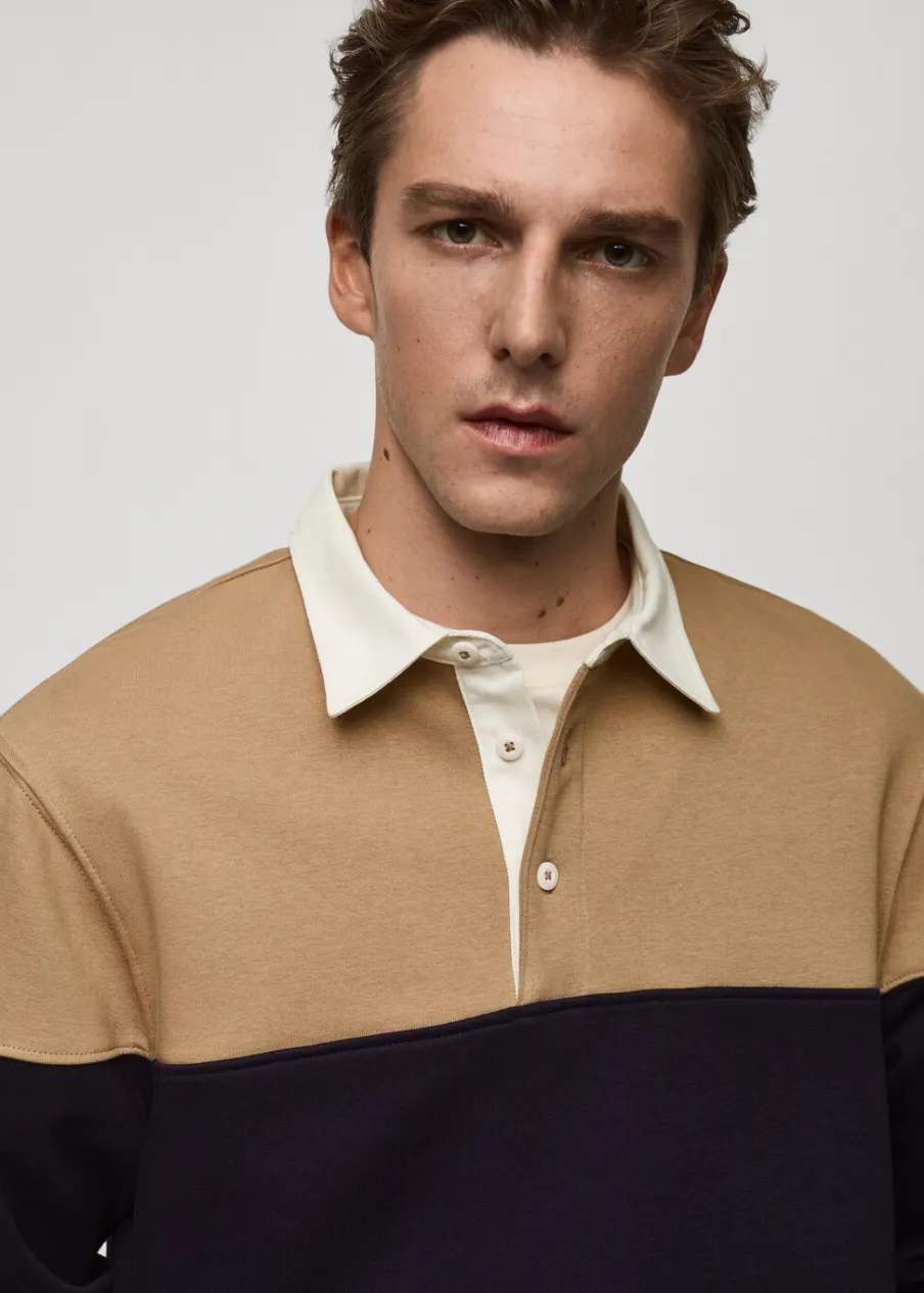 Regular fit, pamut anyag, gombbal záródó pólónyak, kétszínű modell, passzés mandzsetta és alj, a modell testmagassága 185 cm és M-es méretet visel.