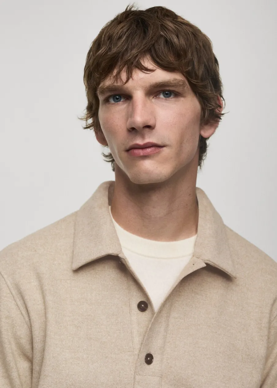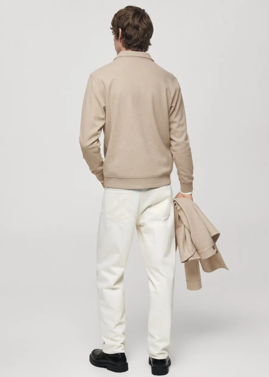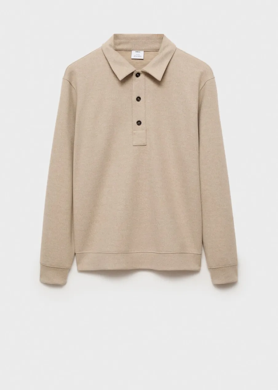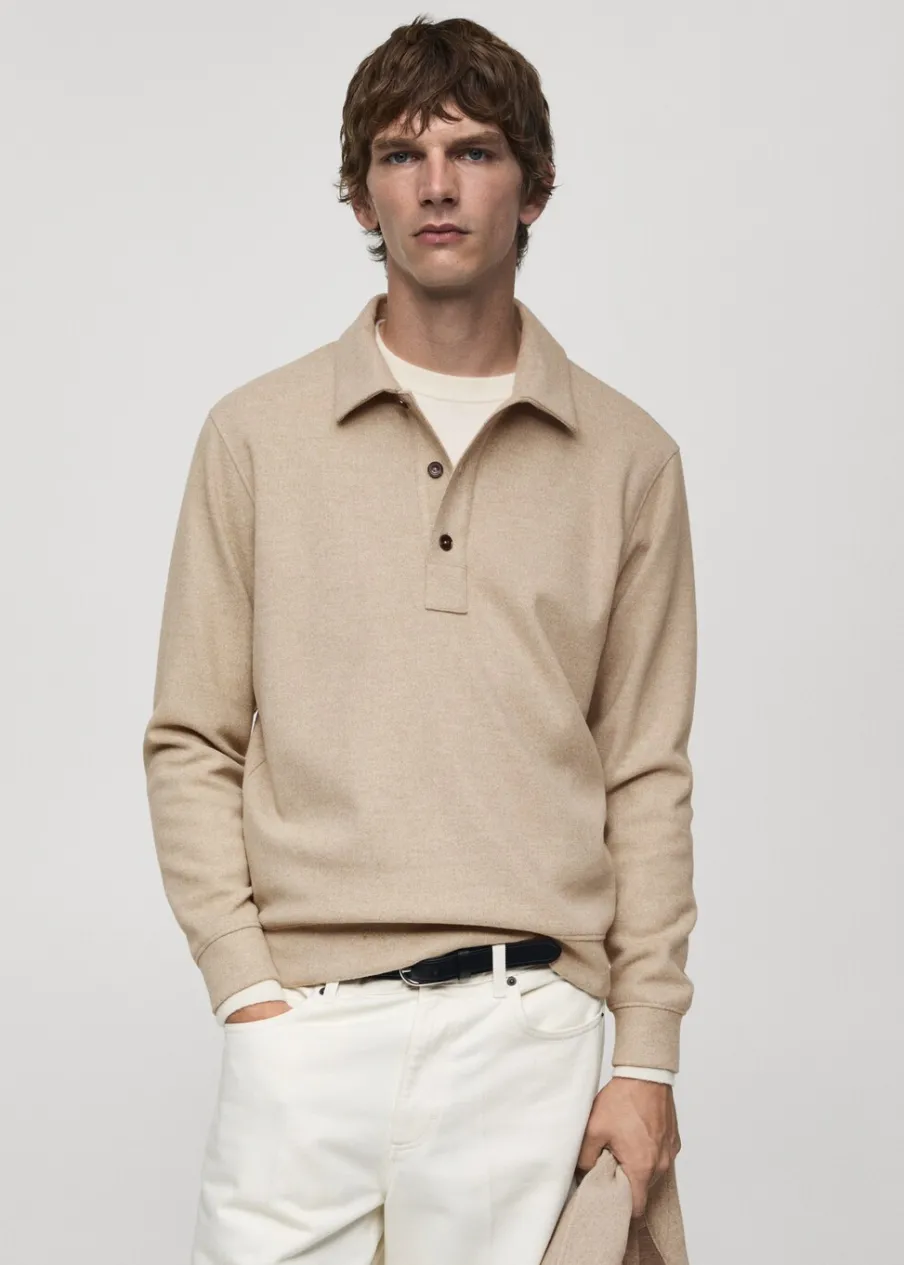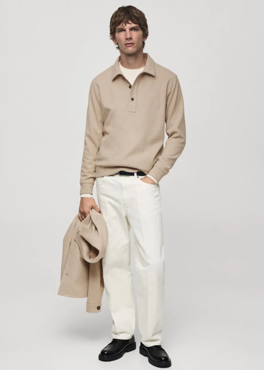 Krój regular. Dzianina dresowa. Materiały z recyklingu. Kołnierzyk polo z zapięciem na guziki. Długi rękaw. Mankiety i dół wykończone ściągaczem. Prosty dół. Model ma 190 cm wzrostu i nosi rozmiar M.