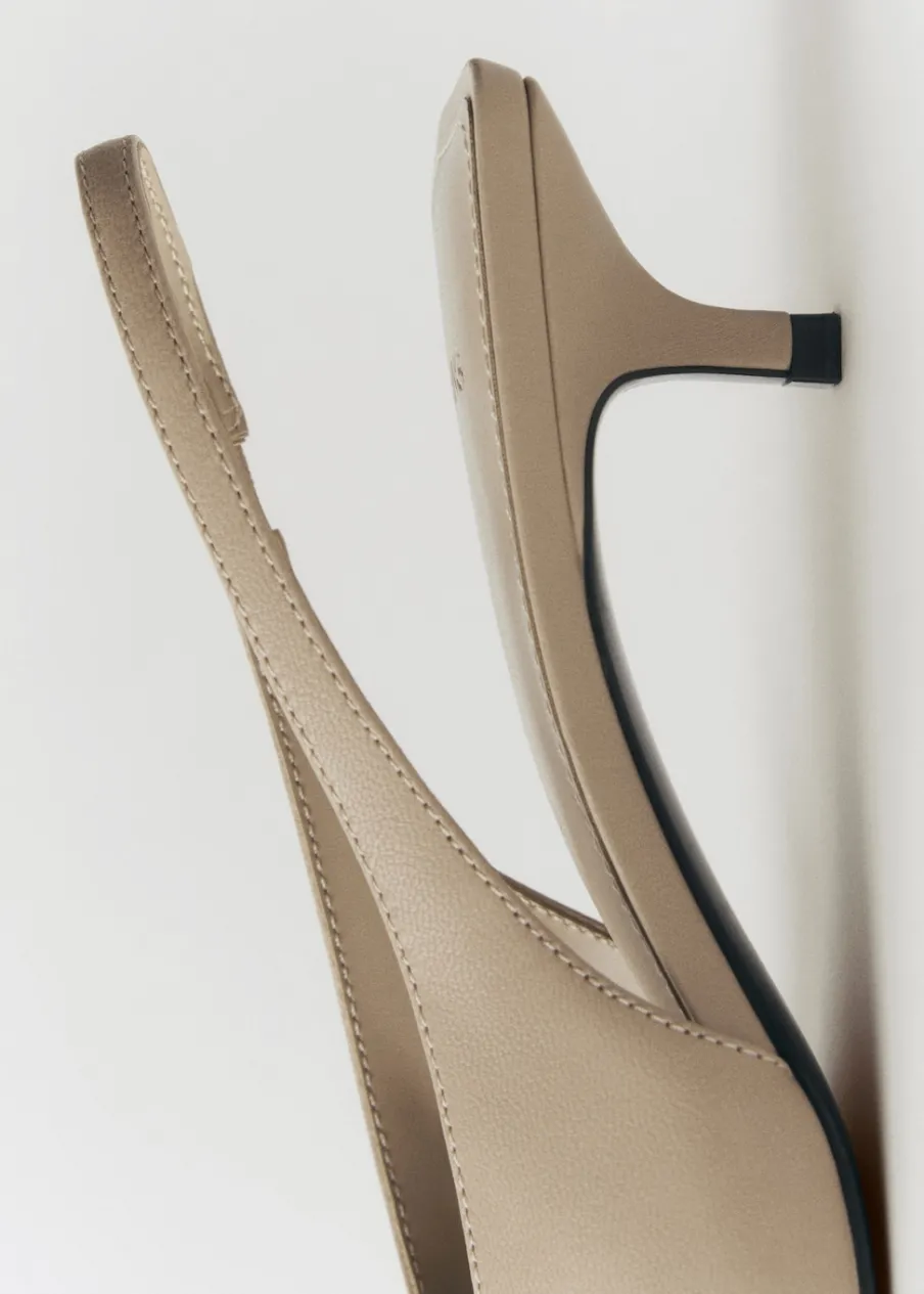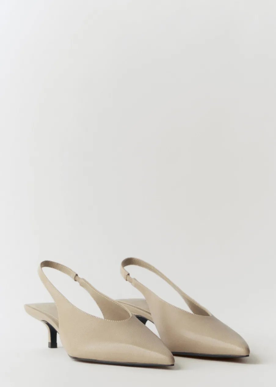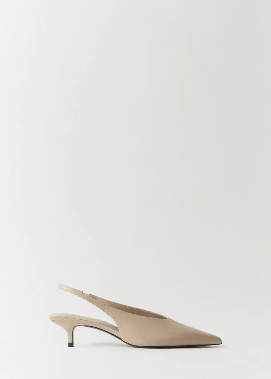 Obcas typu kitten. Spiczaste zakończenie. Obcas mierzy 4 cm. Zapięcie na klamrę. Wewnętrzna podszewka. Skóra kozia. Fason z odkrytą piętą.