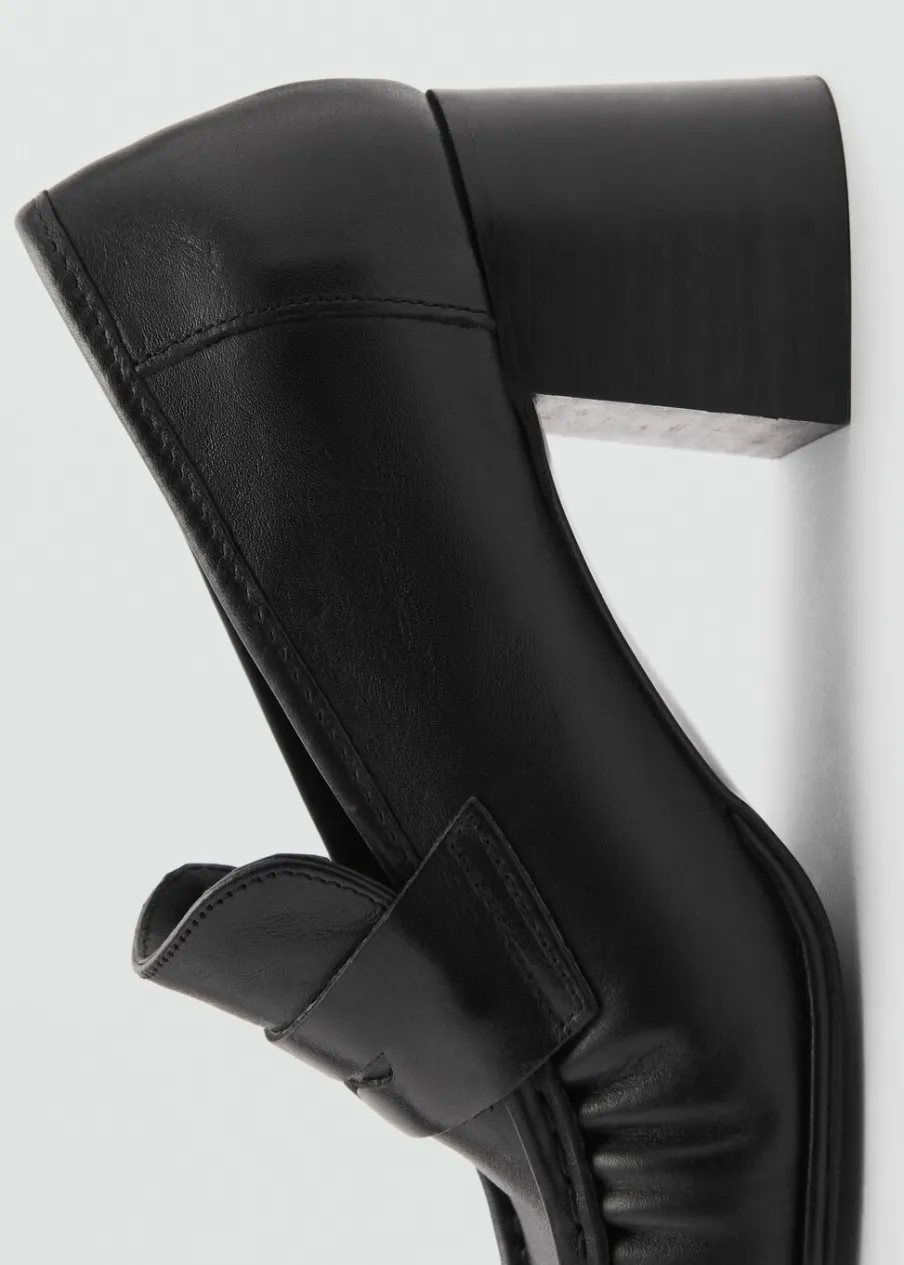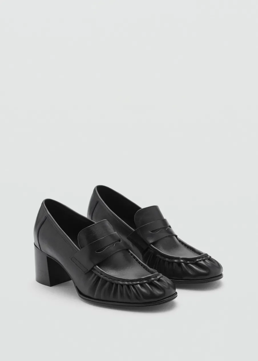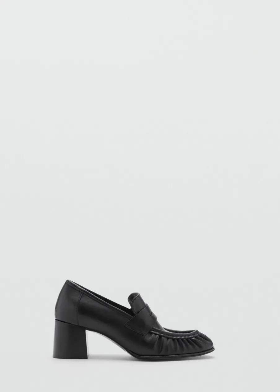 Opis100% skóra bydlęca. Obcas klockowy. Okrągły nosek. Obcas mierzy 6 cm. Bez zapięcia. Marszczony detal.