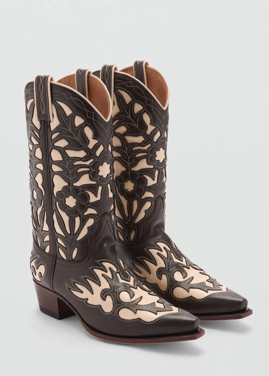 Prostokątny obcas. Spiczaste zakończenie. Obcas mierzy 4 cm. 100% skóra bydlęca. W kowbojskim stylu. Dwukolorowy deseń.