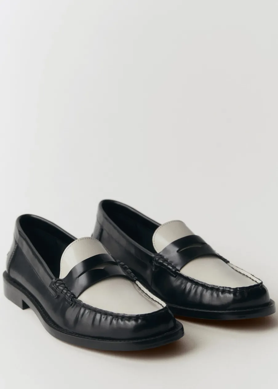 100% skóra bydlęca. Dwukolorowy deseń. Okrągły nosek. Płaska podeszwa. Bez zapięcia. Kontrastowy detal.