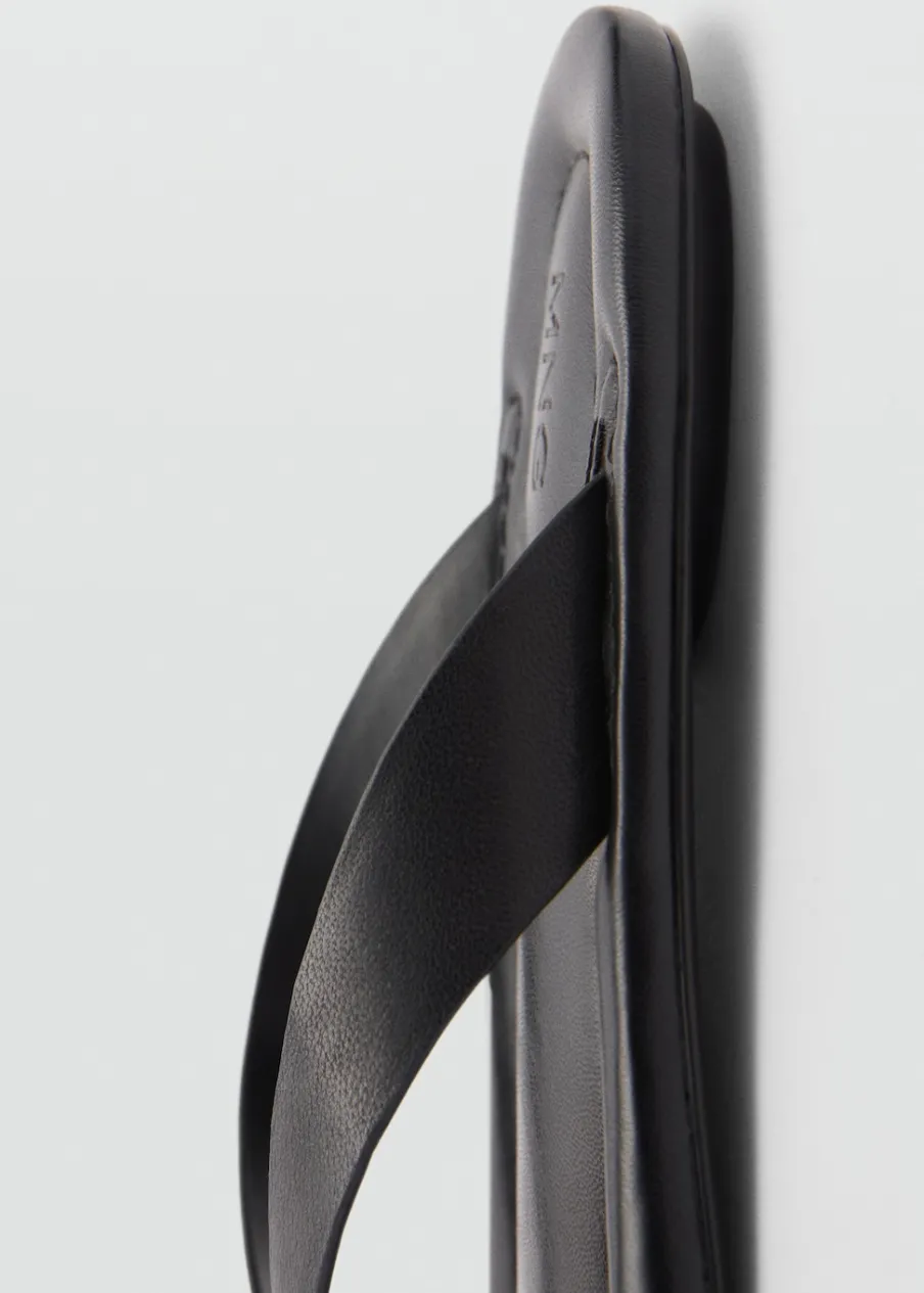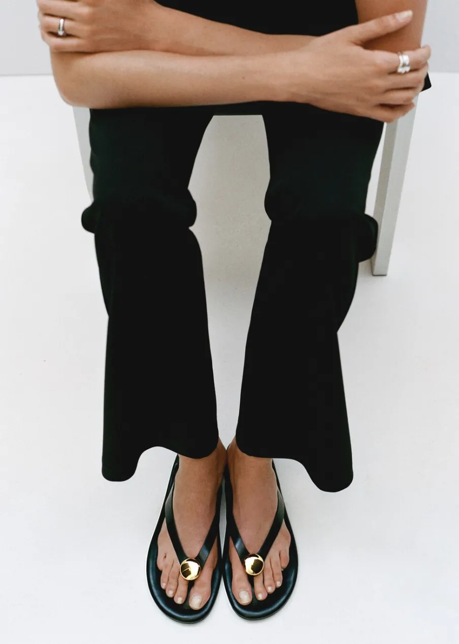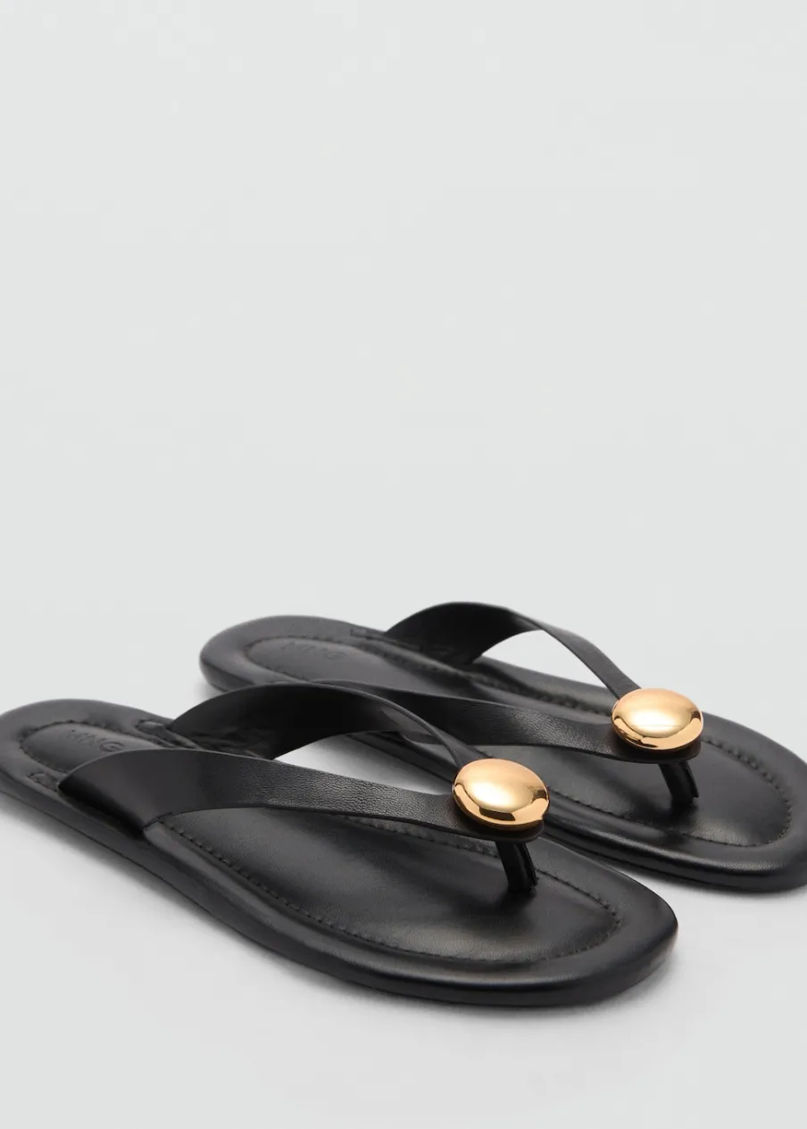 100% skóra kozia. Fason z odkrytą piętą. Płaska podeszwa. Okrągły nosek. Bez zapięcia. Metalowa ozdoba. Wyłącznie online. Model z paskiem między palcami.