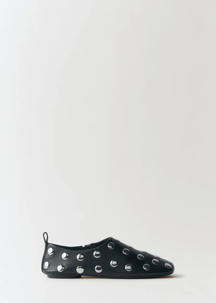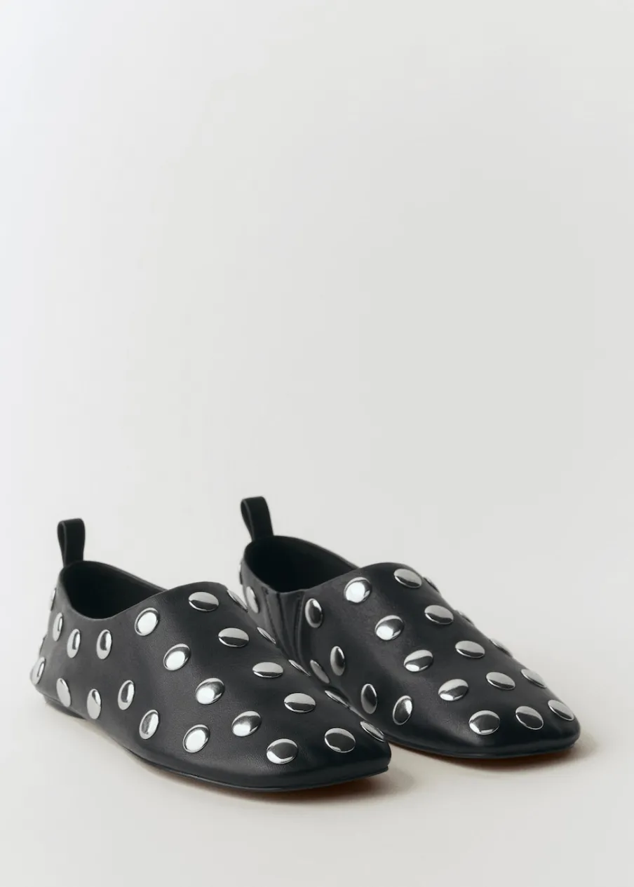 OpisPłaska podeszwa. Okrągły nosek. Ozdobne ćwieki. 100% skóra kozia.