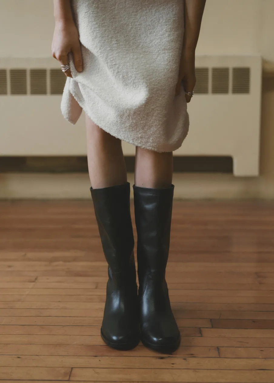100% skóra bydlęca. Płaska podeszwa. Okrągły nosek. Wysoka cholewka. Bez zapięcia. Wewnętrzna podszewka.