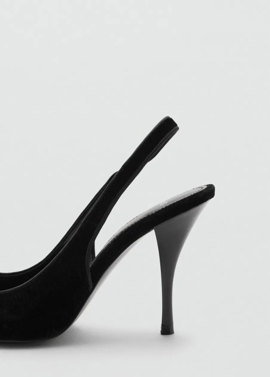 Aksamitna tkanina. Spiczaste zakończenie. Obcas szpilka. Obcas mierzy 9,5 cm. Wysoki obcas. Kolekcja wizytowa.