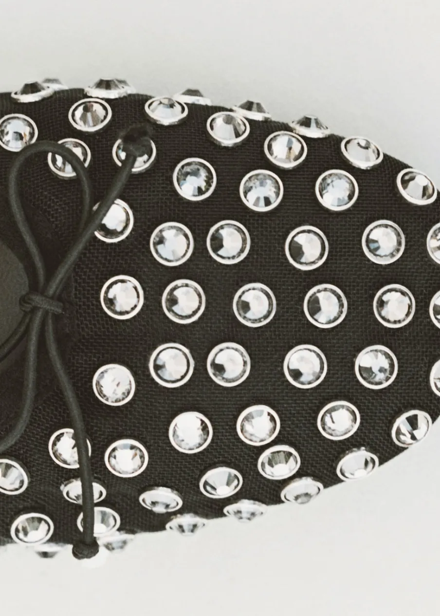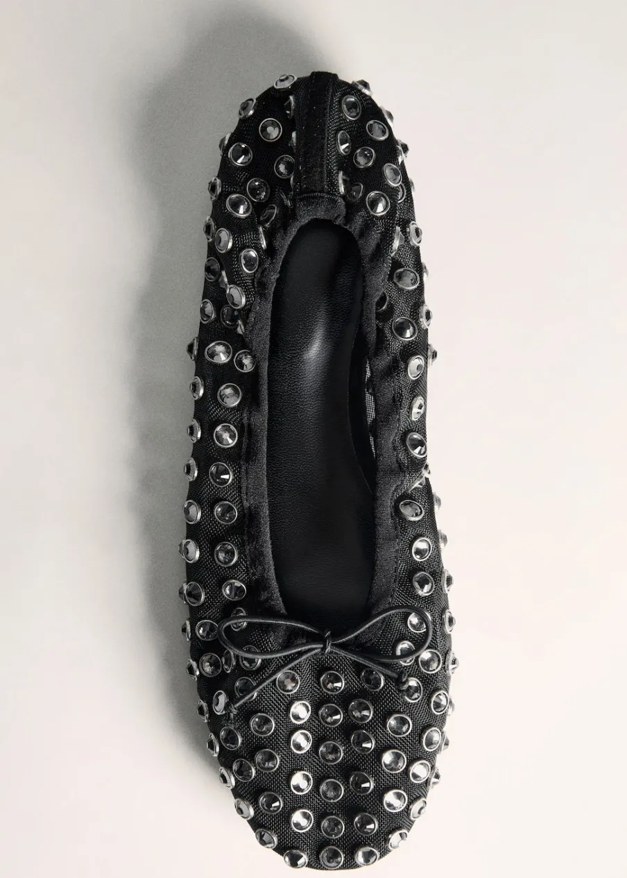 Siateczkowa tkanina. Płaska podeszwa. Okrągły nosek. Ozdobne ćwieki.