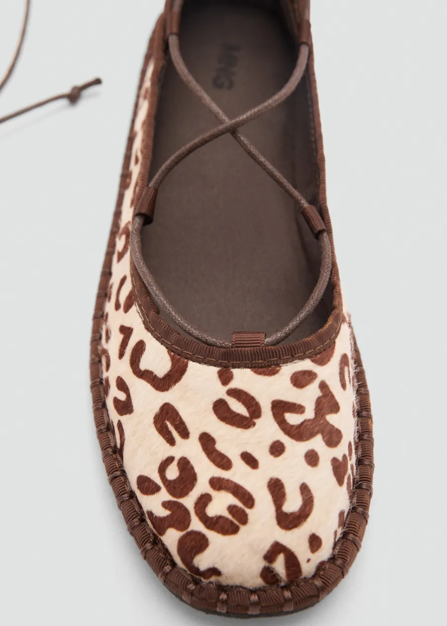 100% skóra. Płaska podeszwa. Okrągły nosek. Wzór w lamparcie cętki. Wiązanie na sznurówki.
