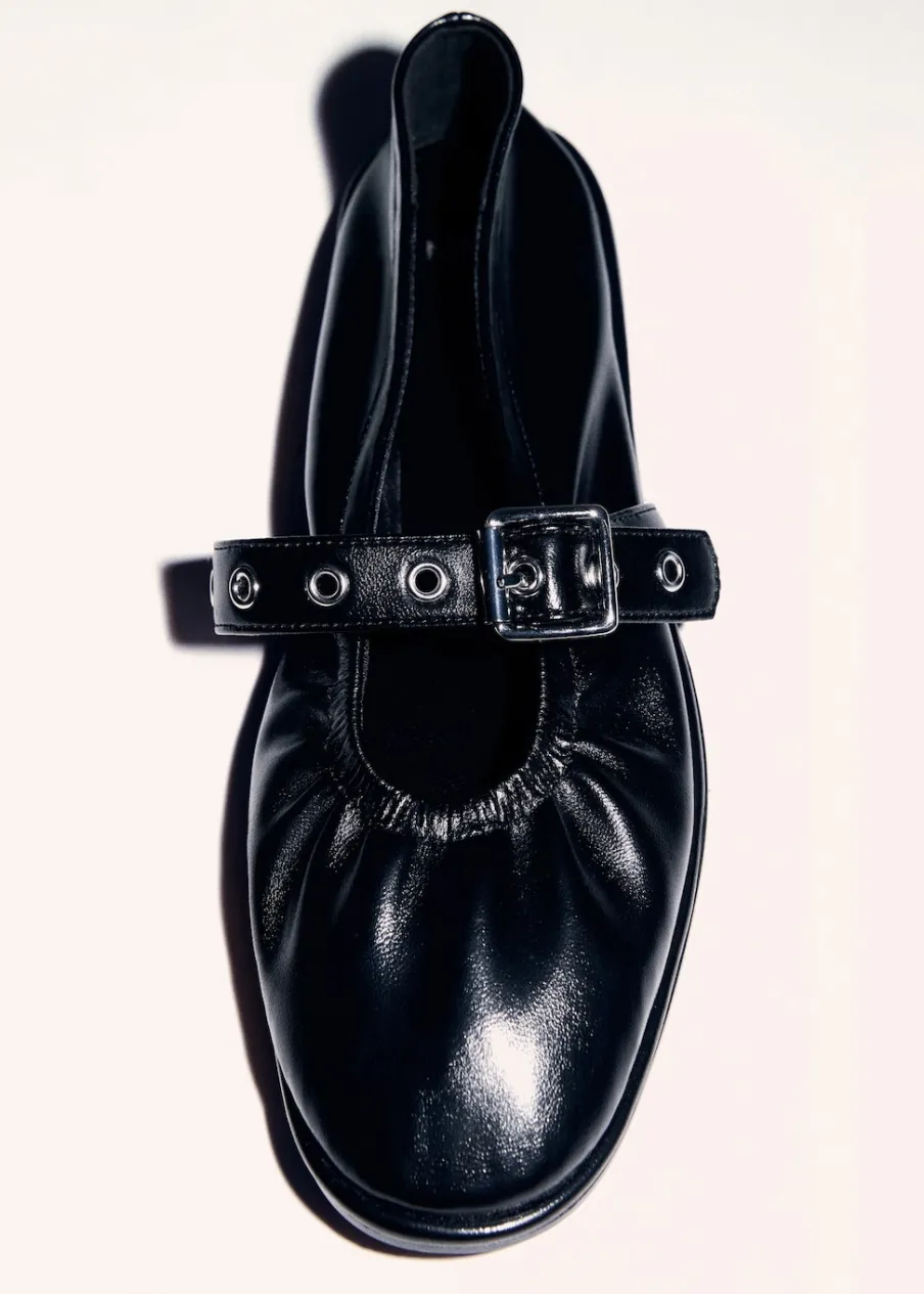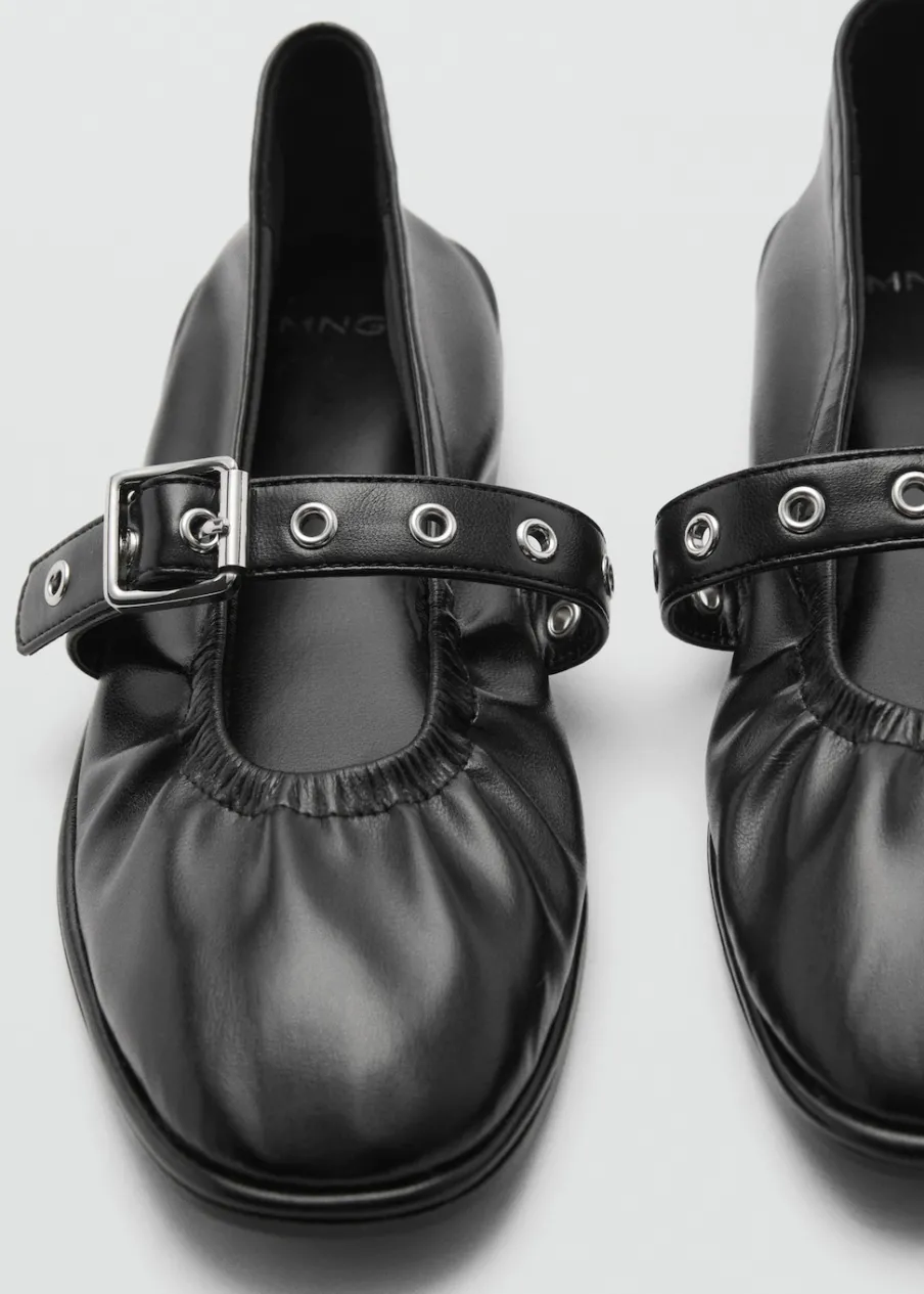 Płaska podeszwa. Okrągły nosek. Zapięcie na pasek ze sprzączką. Wyłącznie online. Kolor złoty dostępny tylko online.