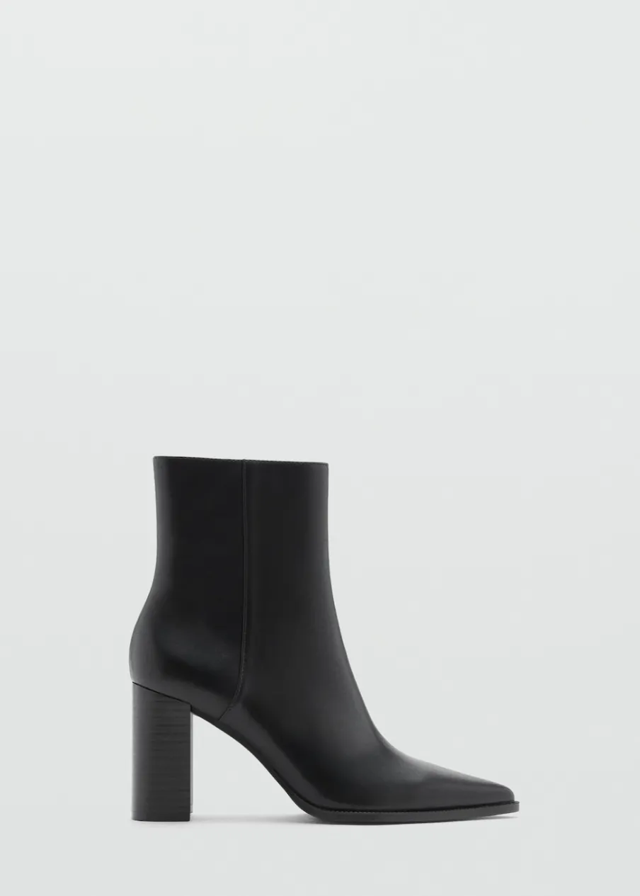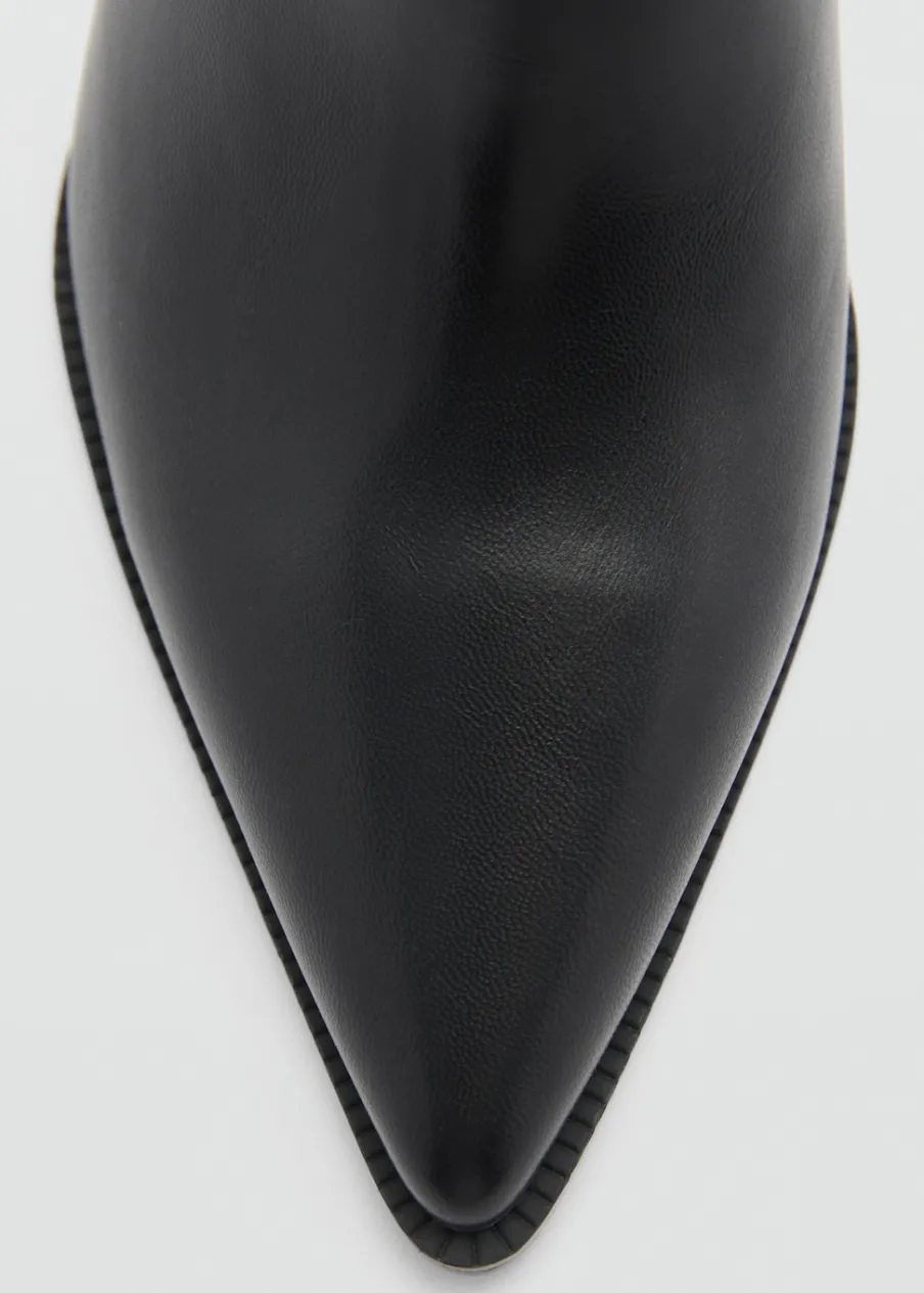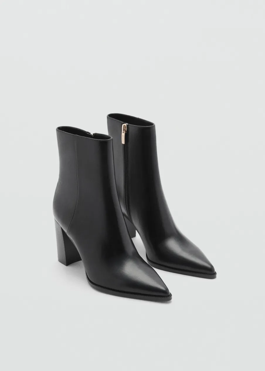 Efekt skóry. Spiczaste zakończenie. Obcas klockowy. Obcas mierzy 8 cm. Boczne zapięcie na suwak.