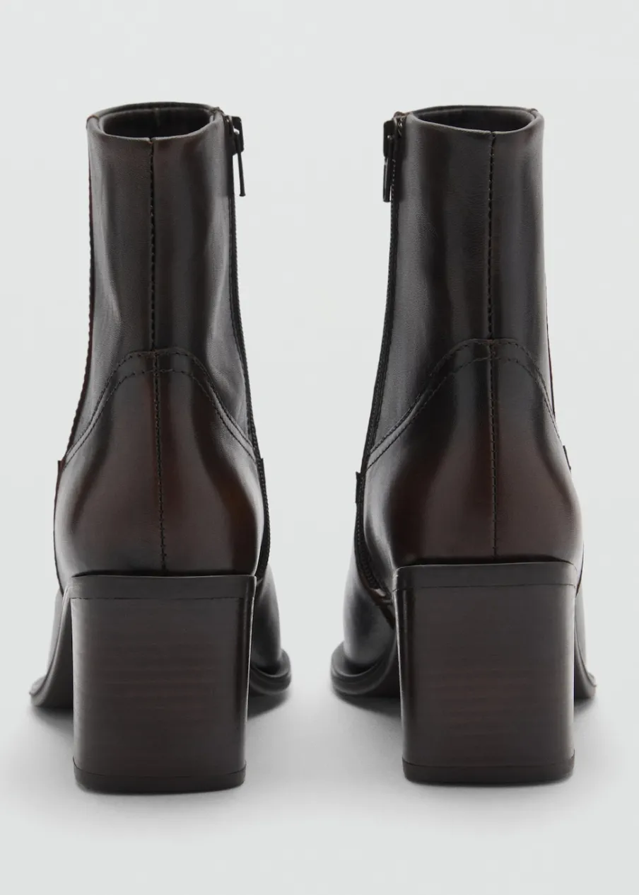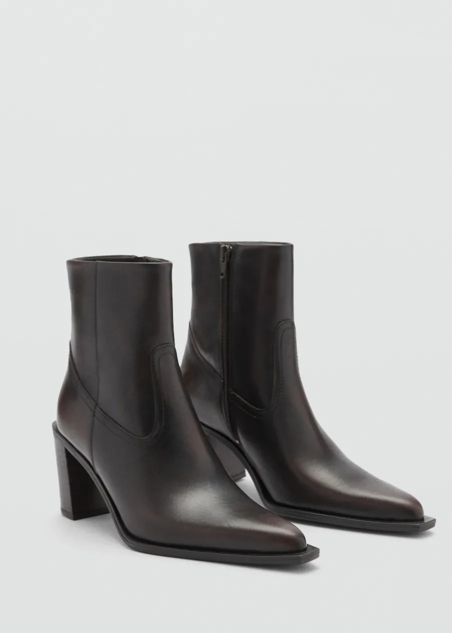 Skóra owcza 100%. Spiczaste zakończenie. Obcas klockowy. Zapięcie na zamek z boku. Obcas mierzy 7,5 cm.